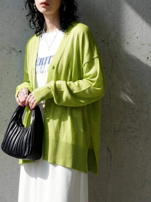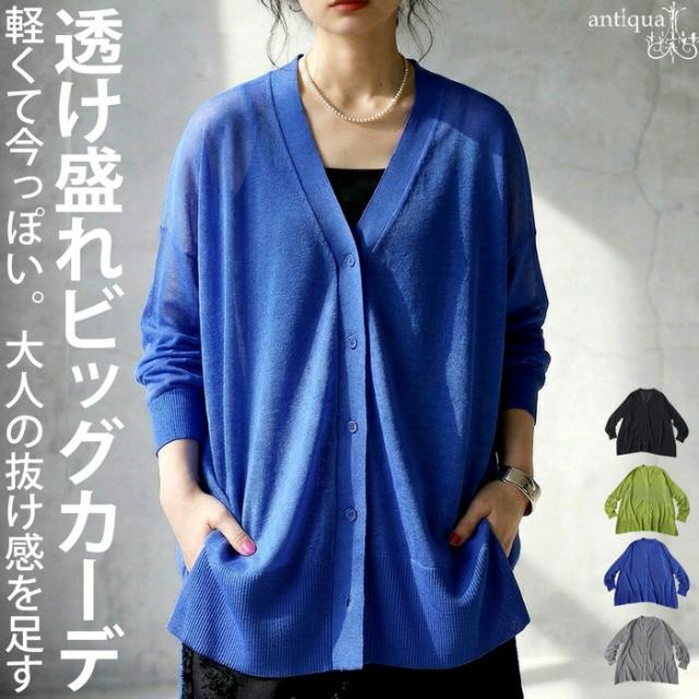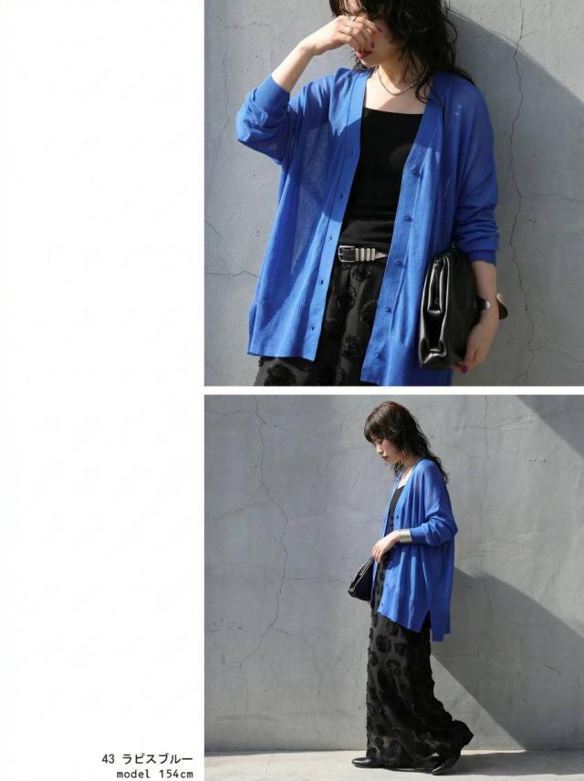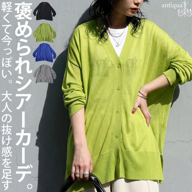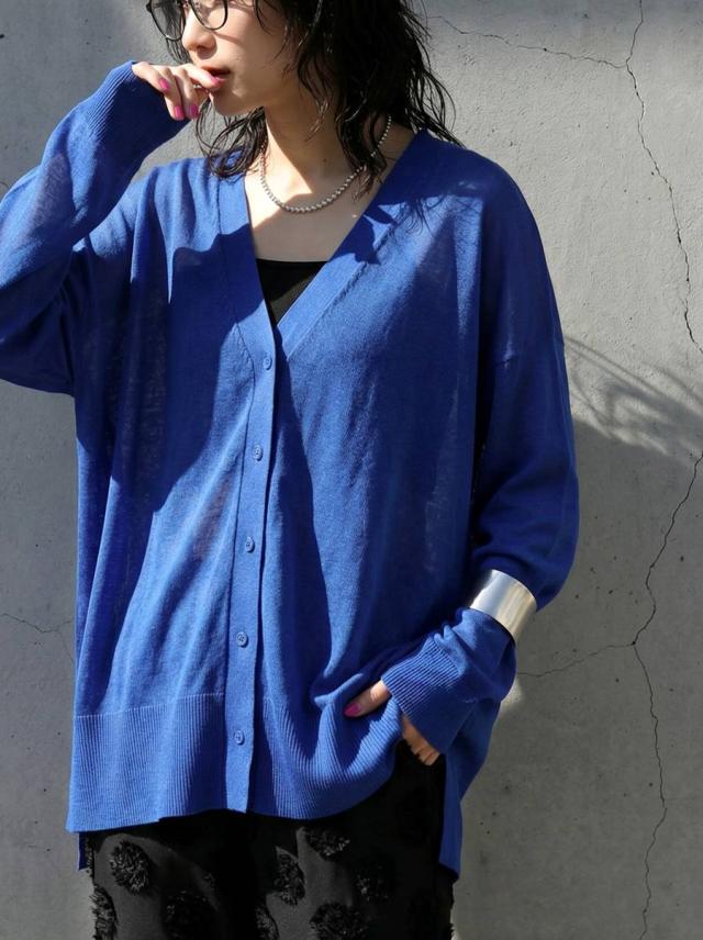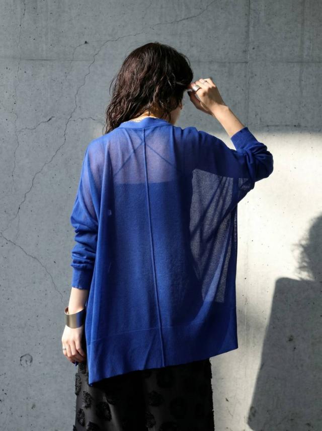 シアー素材を使用した、透け感が魅力のカーディガン(シアーカーディガン・サマーニット・羽織り)です。