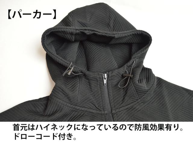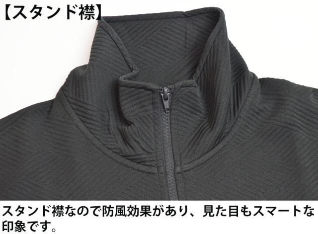 ■襟元は高めに設定されたハイネックのデザインなので、ジップを全閉すれば、防風、防寒対策もバッチリ!