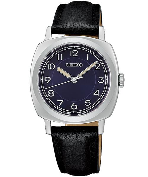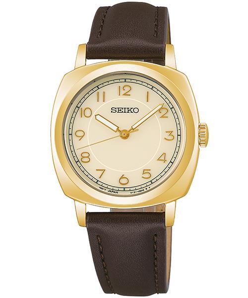 クッションケースの柔らかなフォルムと、わずかに膨らんだカーブガラスがヴィンテージ感を演出。1960〜70年代のSEIKOアーカイブフォントを採用したアラビア数字インデックスが、クラシカルで可愛らしい印象を与えます。