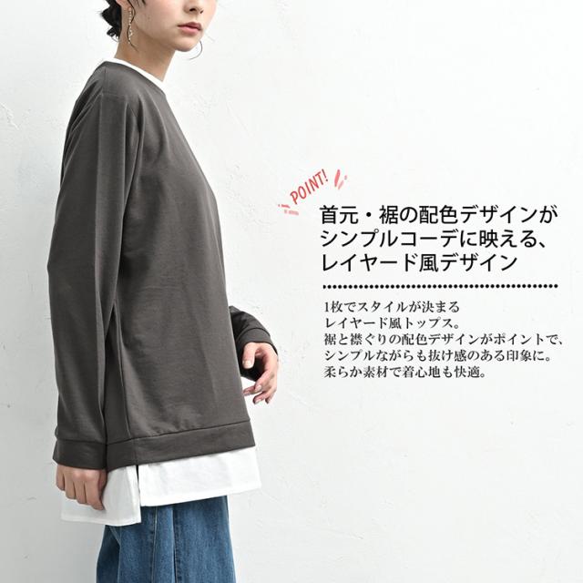 cla-sa-tp0632 【メール便対応】一枚着るだけでスタイルが決まる長袖フェイクプルオーバー。 大きいサイズ レディース 長袖トップス 長袖プルオーバー 長袖カットソー 長袖Tシャツ フェイクプルオーバー 重ね着風 フェイクレイヤード 無地 Uネック クルーネック ラウンドネック 丸首 長袖 ロングスリーブ サイドスリット シンプル バイカラー切り替え 春服 秋服 春物 秋物 春トップス 秋トップス 体型カバー ゆったり 大きめ 大人 カジュアル フェミニン ナチュラル リラックス 大人可愛い きれいめ かわいい 着こなし おしゃれ 定番 春コーデ 秋コーデ ファッション 大きめ 女性 婦人用 ミセス 30代 40代 50代 2025 秋新作 春 秋 緑 灰色 紺 LL 3L 4L 5L 13号 15号 17号 19号 cla-sa-tp0632