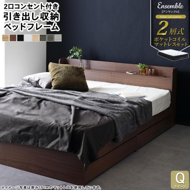 引き出し収納ベッド 2層式ポケットコイルマットレスセット クイーン Q 棚付き RUES ルース Ensemble アンサンブル クイーンサイズ 寝室収納 体圧分散 通気性良 揺れ軽減 快適睡眠