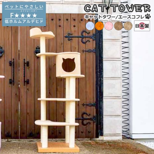 キャットタワー 国産 Ace coffret エース コフレ 日本製 据え置き型 手づくり 強固な構造 型崩れしにくい インテリア ハウス付き スリム コンパクト 室内飼い 運動不足解消 爪とぎ リラックス 木登り 大型猫 子猫 ねこ ネコ にゃんこ
