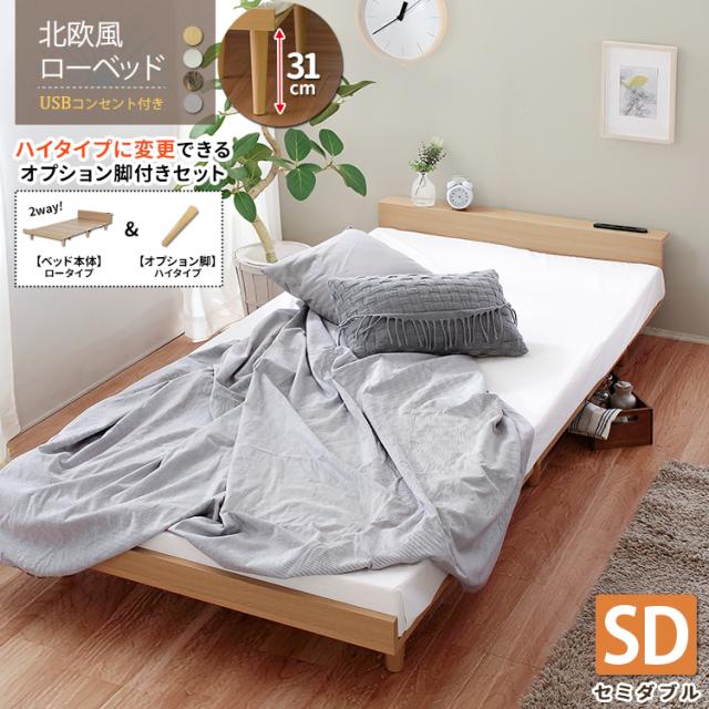 ベッド セミダブルサイズ ハイタイプオプション付き コンセント USBポート 宮付き 棚付き すのこ