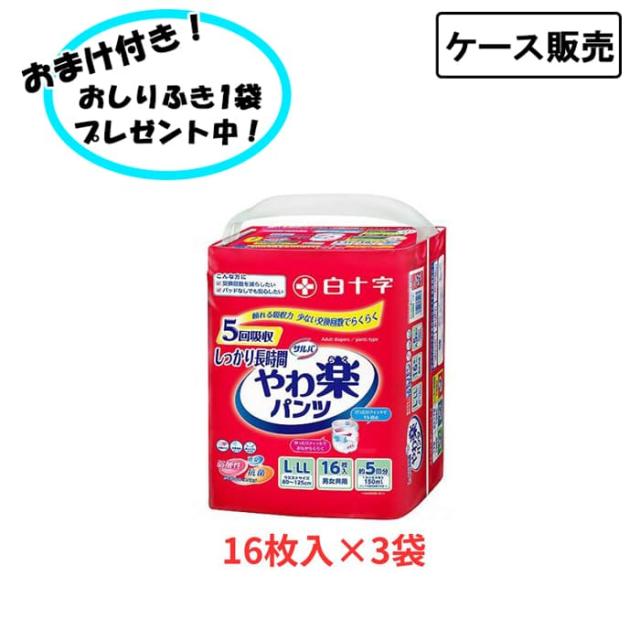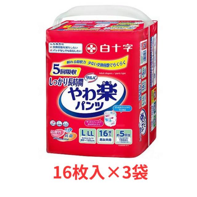 【ケース販売】サルバ やわ楽パンツ しっかり長時間 L-LLサイズ 1ケース(16枚入×3袋)まとめ買い パンツタイプ 白十字 (介護 おむつ 紙パンツ) 介護用品 失禁対策 尿漏れ対策 在宅介護 施設 リハビリ