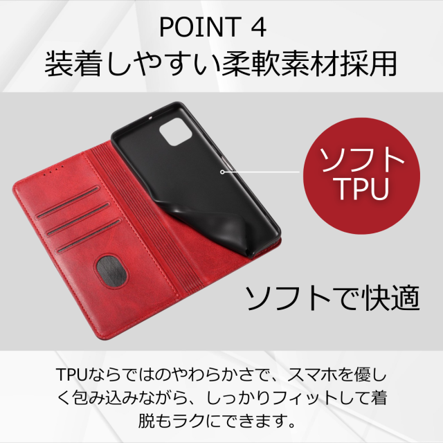 外側は高級感のあるPUレザー、内側は衝撃をやわらげるTPU素材を採用し、大切な端末をしっかり保護します。