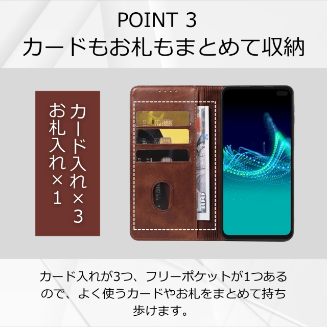 収納:カードポケット×3、紙幣やレシートが入るフリーポケット×1