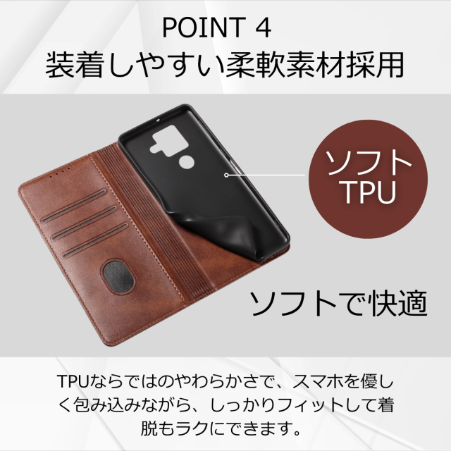 外側は高級感のあるPUレザー、内側は衝撃をやわらげるTPU素材を採用し、大切な端末をしっかり保護します。