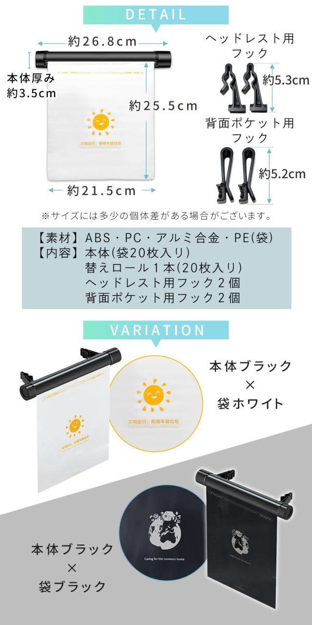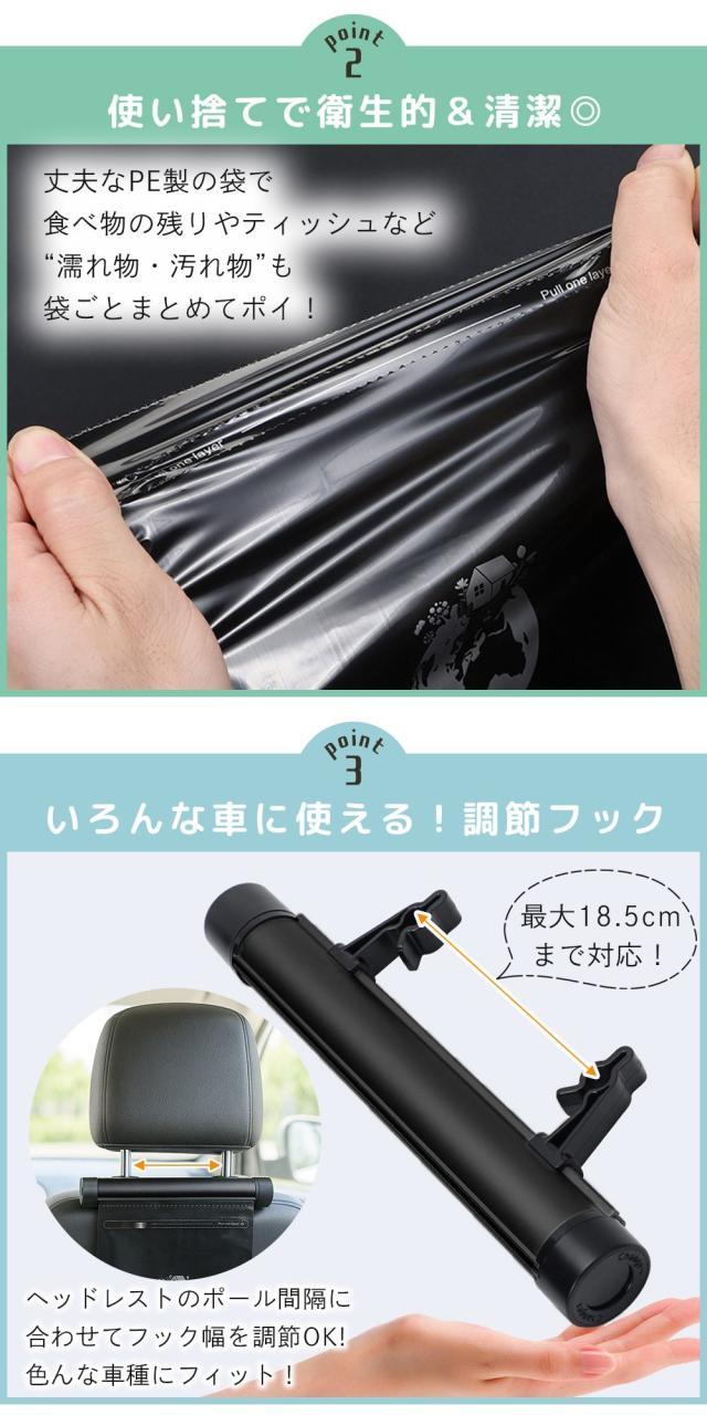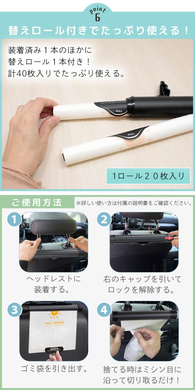 ゴミポケット/ローラー/収納/ローラー式/車載/袋/ごみ箱/屑入れ/清潔/厚手PE袋/引き下ろし式/シートヘッドレスト/シート背面ポケット/調節フック付き/使い捨て/ビニール/簡単取付/省スペース/便利グッズ/後部座席/カー用品/アクセサリ/車用/防水/吊り下げ/ドライブ/ポイ捨て防止/エチケット/ゴミ袋40枚入り/切り取り簡単/おしゃれ