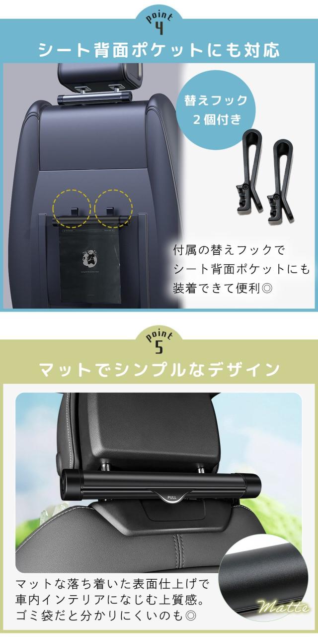 【mitas公式】車載ローラー式ゴミポケット 調節フック付き おしゃれ ヘッドレスト 取り付け簡単 吊り下げ 省スペース 後部座席 シート背面ポケット対応 ゴミ袋40枚入り 替えロール付 厚手PE 防水 引き下ろし式 切り取り簡単 使い捨て 車用 ごみ箱 屑入れ