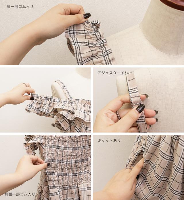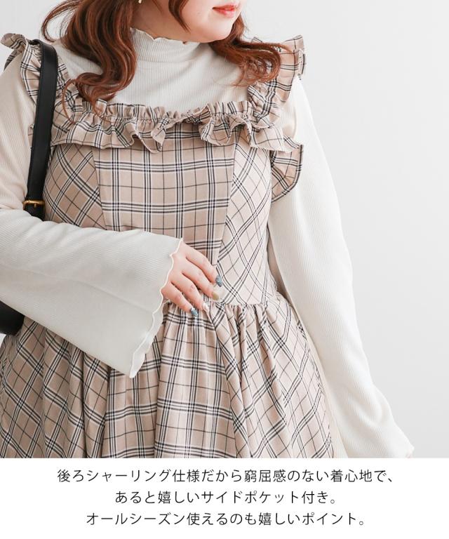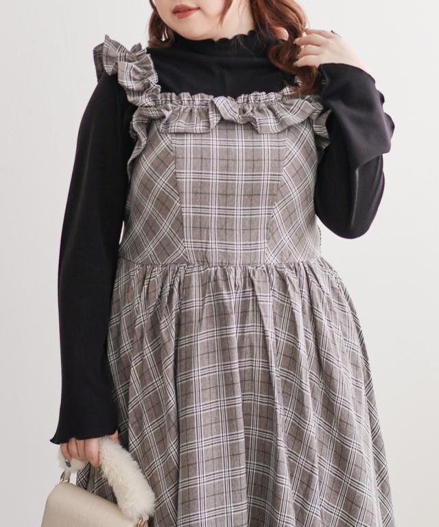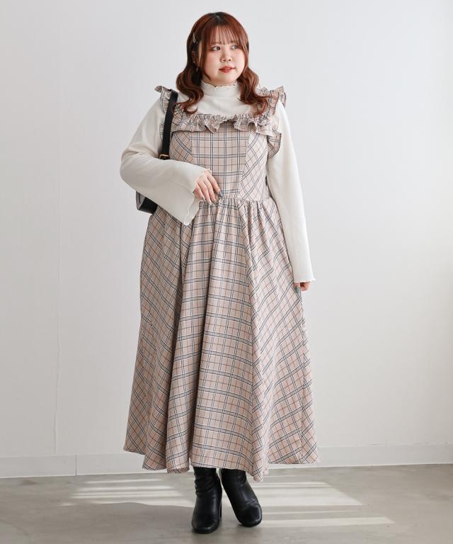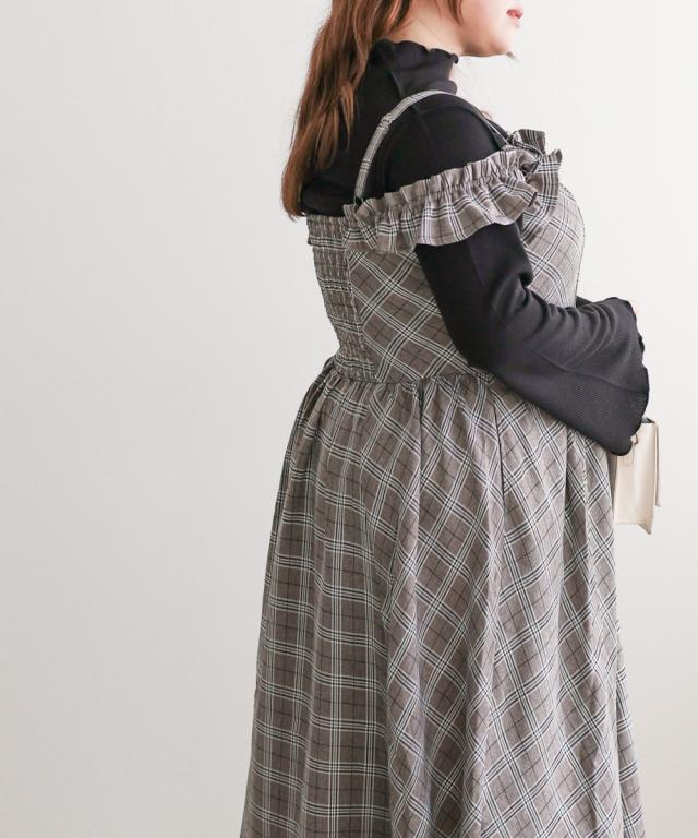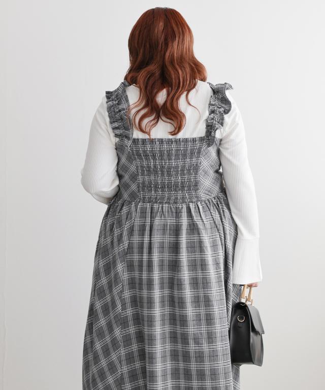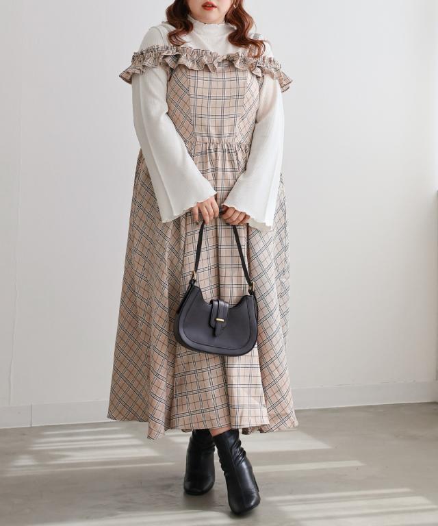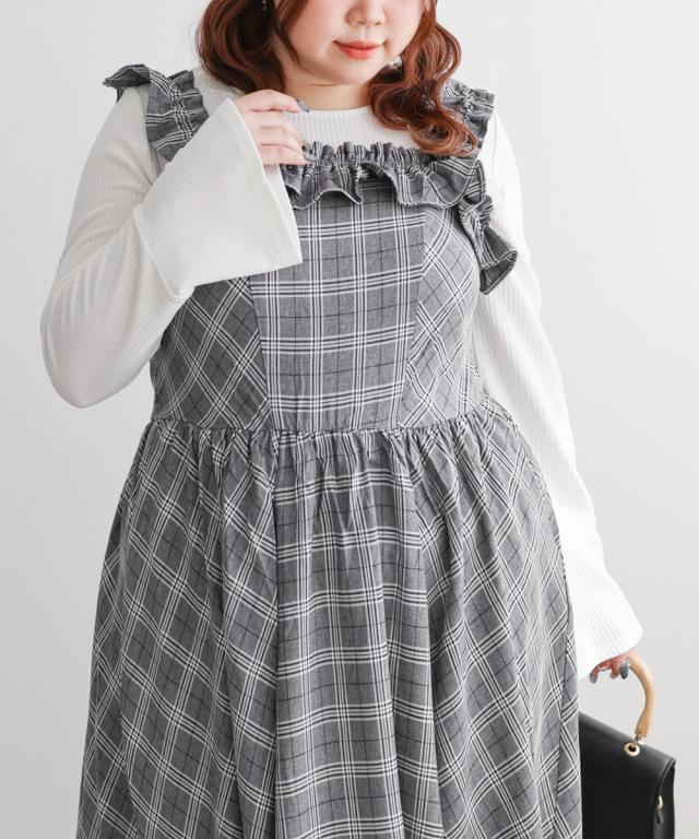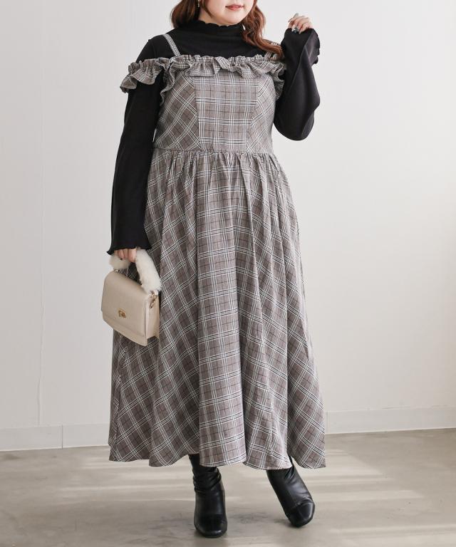 | 3Lサイズを着用しましたが、ちょうどいいサイズ感です。さらりとした生地で着心地が軽く、長時間着ても快適そうです◎フリルが顔まわりを華やかに見せてくれ、ウエストの切替デザインがスタイルをすっきり見せてくれます。肩紐のフリルは2WAY仕様で、フリルを下げて着ると抜け感が出てすっきりメリハリのある印象でしかも可愛いです!!チェック柄が今っぽくて、オールシーズン使えるのがうれしいポイントです! |