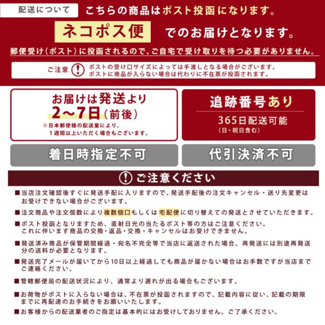 | 【ネコポス便】での配送のため到着日・到着時間の指定はできません。 ポスト投函となりますので代金引換をお受けできません。 郵便局留め、ヤマト・佐川センター留めはお受け出来ません (局留めご希望の場合は宅配便アップグレードを利用してお客様送料負担の宅配便出荷にて対応します)。 注文商品や注文個数により複数個口もしくは宅配便に切り替えての発送とさせていただきます。 ※当店の物品補償基準に基づき配送業者を指定しておりますのでお客様からのご指定は基本的にはお受けしておりません。ご了承ください。 |