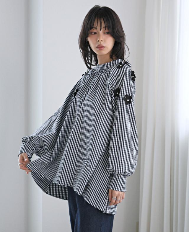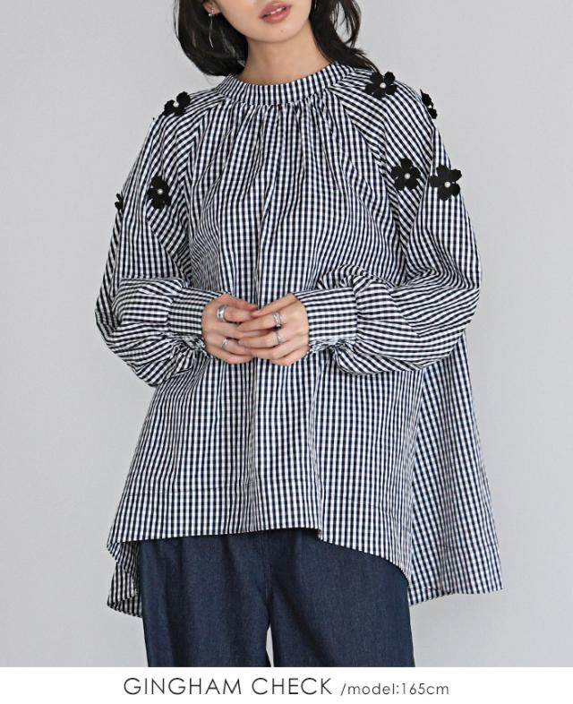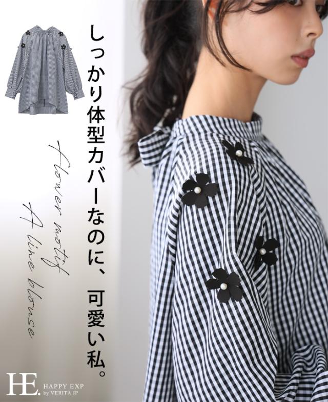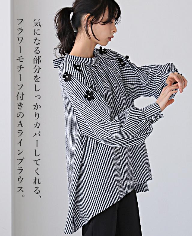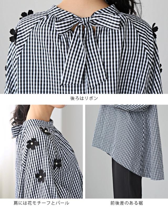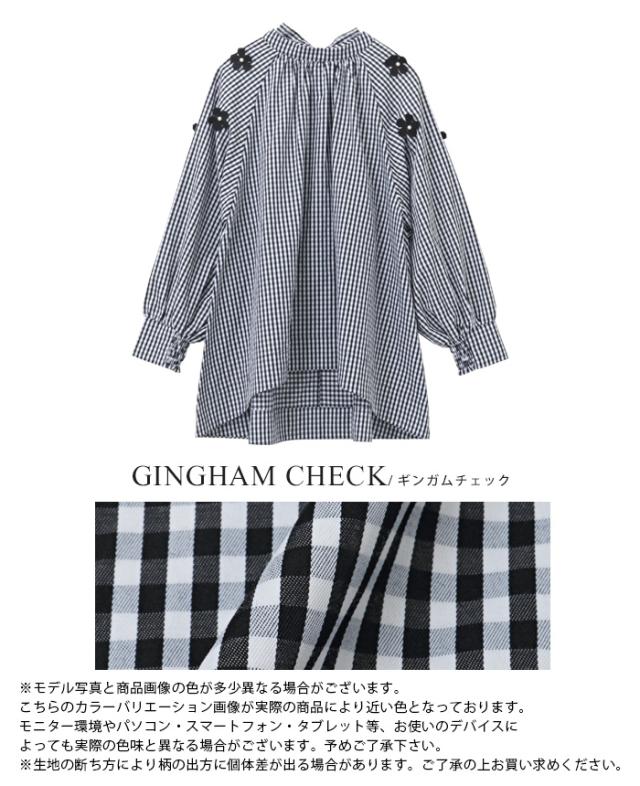 フラワーモチーフAラインブラウス シャツ チェック 花 リボン レディース トップス チュニック ボリューム袖 体型カバー 秋新作【メール便不可】