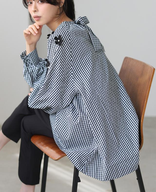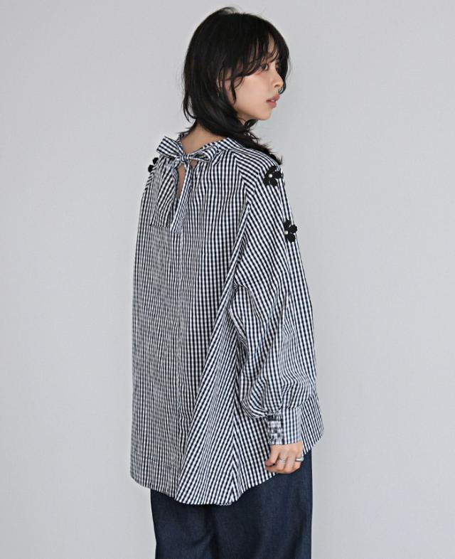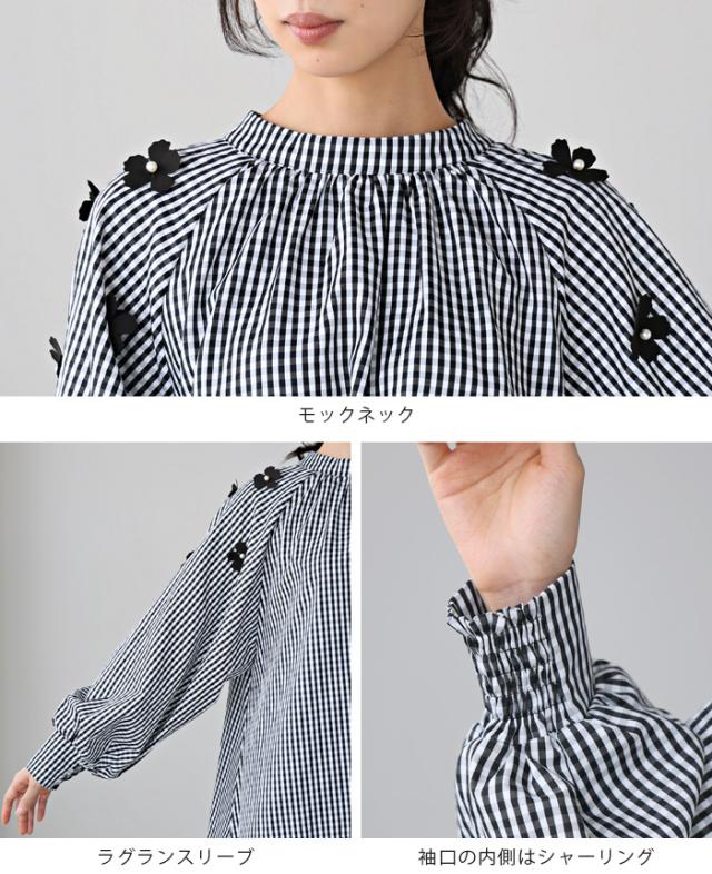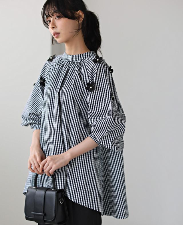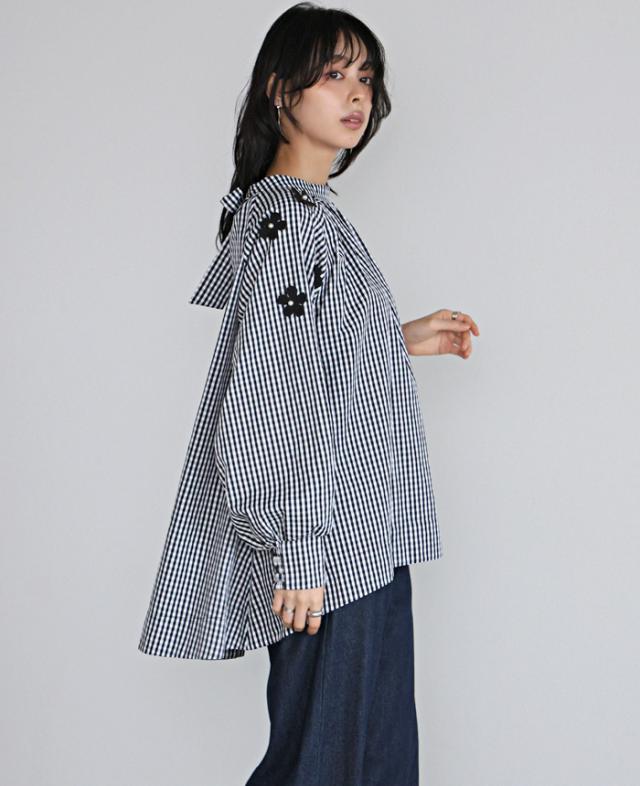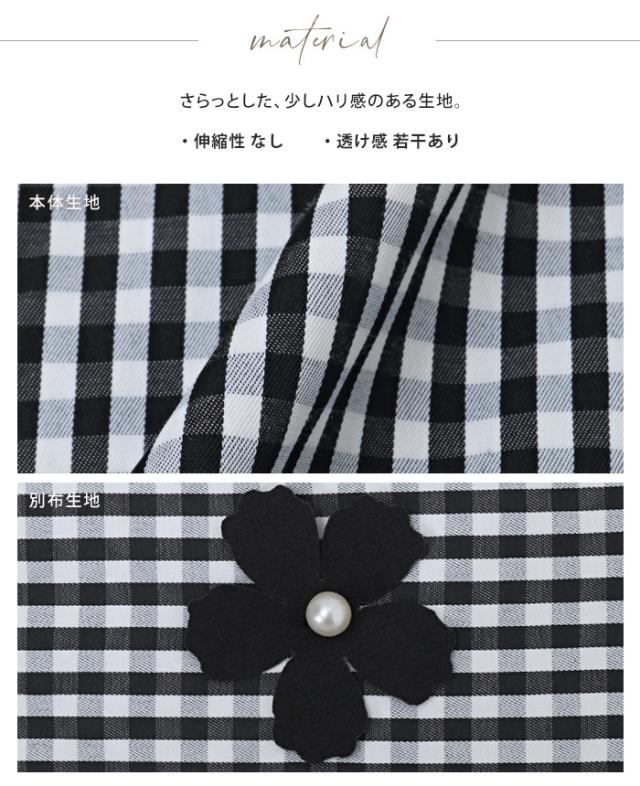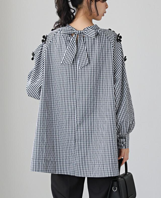 フラワーモチーフAラインブラウス シャツ チェック 花 リボン レディース トップス チュニック ボリューム袖 体型カバー 秋新作【メール便不可】
