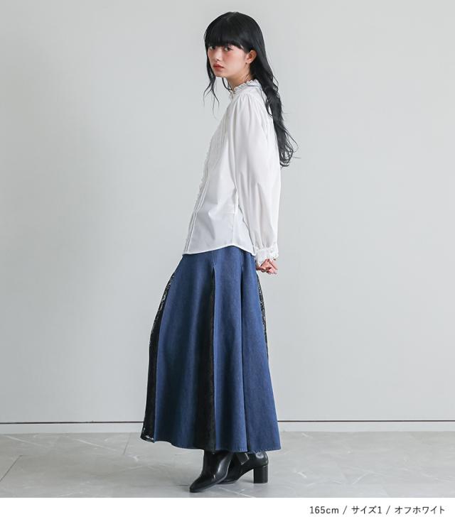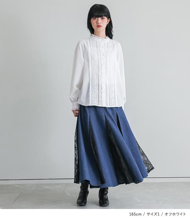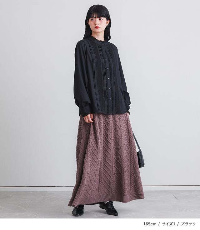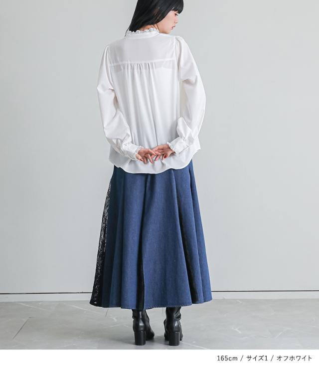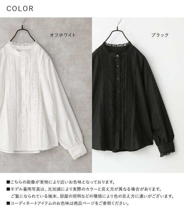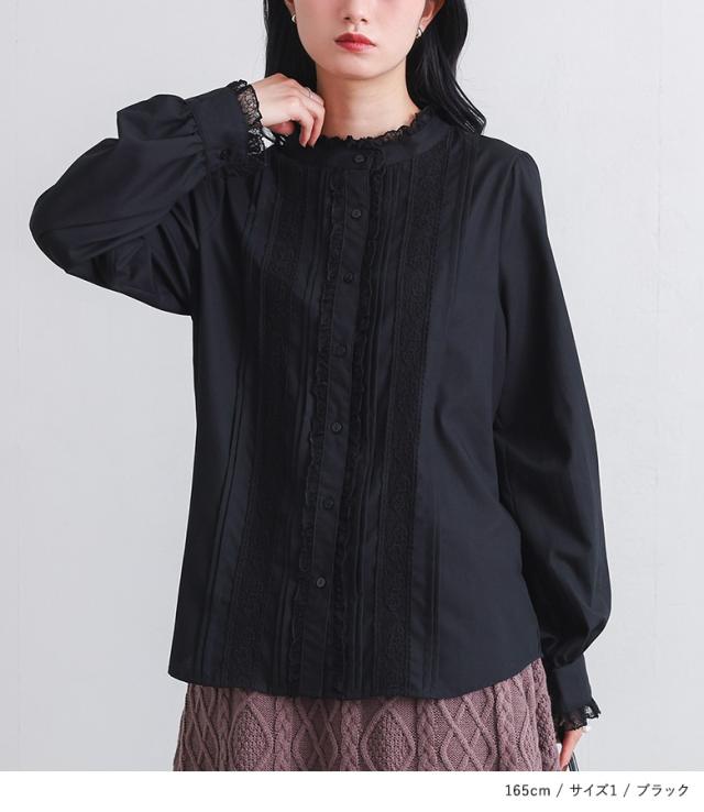 <冬新作>『ピンタックレースフリルブラウス』※メール便可※【10】[ブラウス 長袖 レディース トップス フリルネック バンドカラー ぽわん袖 レース ピンタック 刺繍 春 秋 冬]