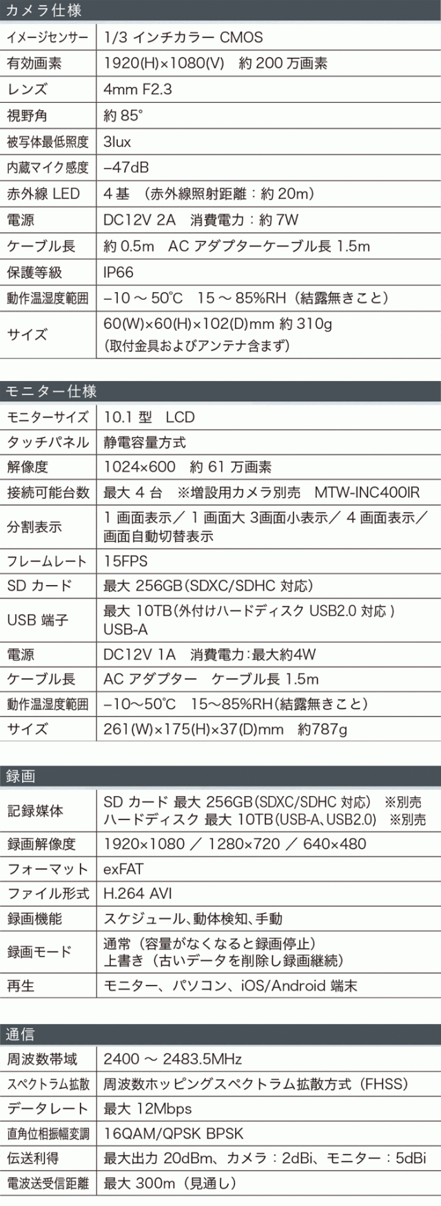 MT-WCM400-1は、屋外設置対応の200万画素屋外用ワイヤレスバレット型防犯カメラ[MTW-INC400IR]1台と、10.1インチタッチパネルモニター録画機のセット商品です。