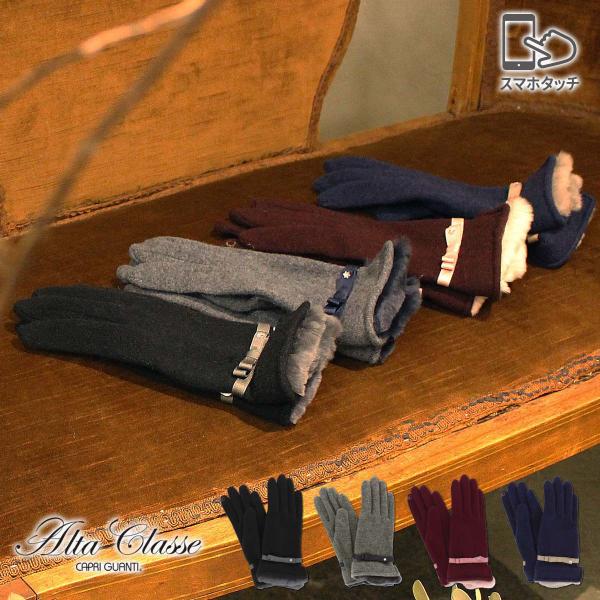 手首部分に花型ラインストーンをあしらったリボンを施したスマホ対応手袋です。裾部分に肌触りのよいレッキスラビットを用いた、人気ブランドアルタクラッセらしい上品なデザインです。膨らみ感のあるウール素材、手首のファーで手首までふんわりと温めてくれます。スマートフォン対応なので、寒い日でも手袋を外さずにすみ、暖かいまま過ごすことが出来ます。プレゼントやクリスマスギフトにもピッタリです。オンにもオフにも、シーンレスにお使い頂ける、万能アイテムです。