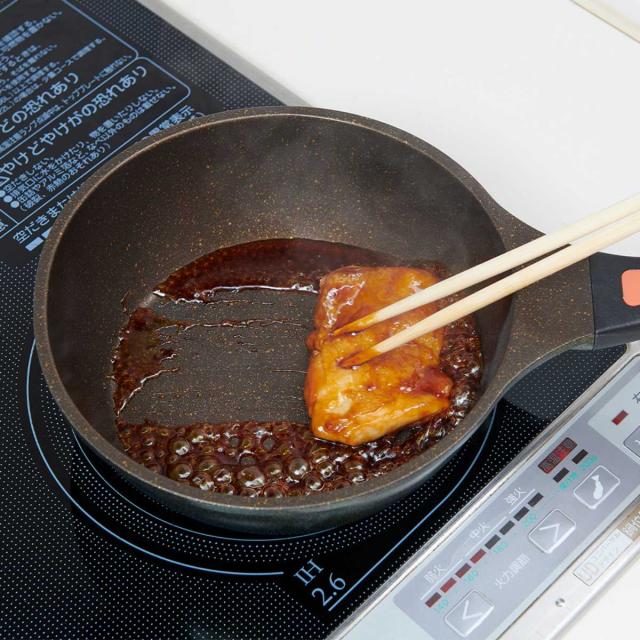 表面のゴールドマーブルコーティング(フッ素樹脂塗装)は、抜群の滑りの良さが自慢です。食材や調味料が焦げ付きにくく、少ない油で調理ができヘルシーで経済的。万一ソースが焦げついた場合も、お水でするんと落とせます。