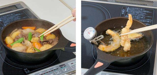 調理したらそのまま食卓にも出せる、小ぶりサイズです。深型なので炒め物もこぼれにくく、煮込み料理や揚げ物など、さまざまな調理に使いやすいです。