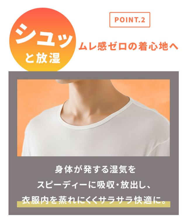 肌が発する湿気をすばやく吸収・放出し、衣服内が蒸れずにずっとサラサラ。