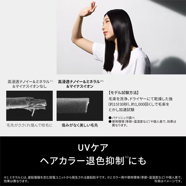 ・ナノケア史上最高のうるおい ・髪悩みにあわせてなりたい髪へ。3つのパーソナルメニュー搭載。 ・ ナノケア史上最高の速乾性 ■カラー:シルキーホワイト ■電源方式:交流式 ■温風温度: 約95℃(風量:強/HOT/STRAIGHTまたはAIRY・室温30℃の時) 約90℃(風量:強/HOT/MOIST・室温30℃の時) ■風量:0.8m3/分(風量:強) ■電源コード長さ:約1.7m ■本体寸法:高さ21.0×幅17.3×奥行7.9cm ■質量:約590g(セットノズル含まず) ■機能: 高浸透ナノイー(第2世代) ミネラル マイナスイオン 退色抑制 静電気抑制 ナノイーイオンチャージPLUS UVケア ■搭載モード: パーソナルケアメニュー:MOIST/STRAIGHT/AIRY 風温モード:温冷リズム/毛先集中ケア/スカルプ/スキン ■電源:AC100V 50-60Hz ■消費電力:1200W ■付属品:セットノズル ■安全に関するご注意:●ご使用の際は、定格15A以上のコンセントを単独でご使用ください(消費電力1000W以上の為) ⇒単独で使用しないと火災や感電の原因となります ※記載は商品仕様の一部です。仕様説明不足等の理由での返品はできません。特に適合等は必ずご確認ください。
