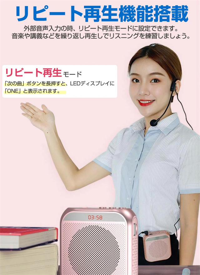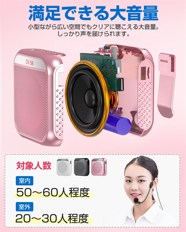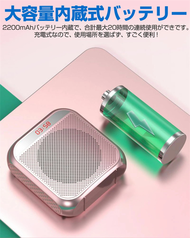 | 仕様 | ■カラー:ホワイト、ブラック、ローズゴールド ■サイズ:93×85×39mm ■本体材質:ABS ■本体重量:約210g ■ヘッドマイク重量:約25g ■マイクケーブル長:95cm ■ストラップ長:70〜123cm ■入力:DC 5V ■最大出力:8W ■周波数特性:50Hz〜10kHz ■マイク入力:3.5mmマイクジャック ■外部入力:USBメモリ、microSDカード ■電源:内蔵リチウムイオンバッテリー(3.7V 2200mAh) ■インターフェイス:Micro ■ロードインピーダンス:2Ω ■充電時間:約4H ■連続使用時間:約20H(50%音量) ■使用環境温度:‐10℃〜45℃ ■商品内容:本体×1、ヘッドマイク×1、ストラップト×1、充電ケーブル×1 |