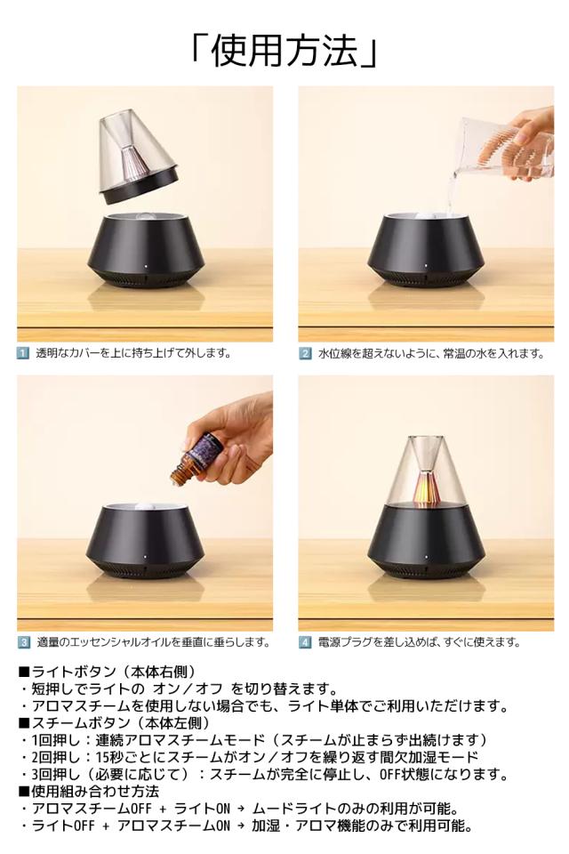 ・ライトOFF + アロマスチームON → 加湿・アロマ機能のみで利用可能。