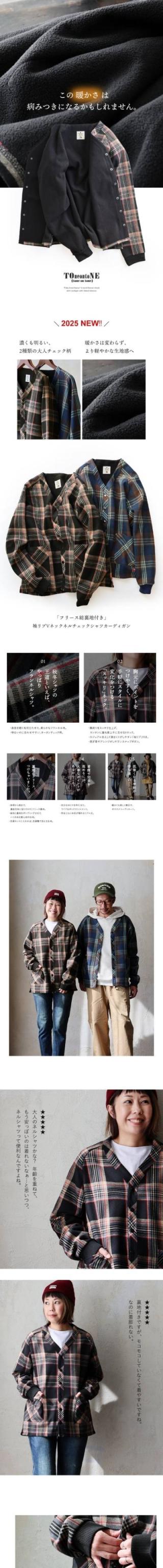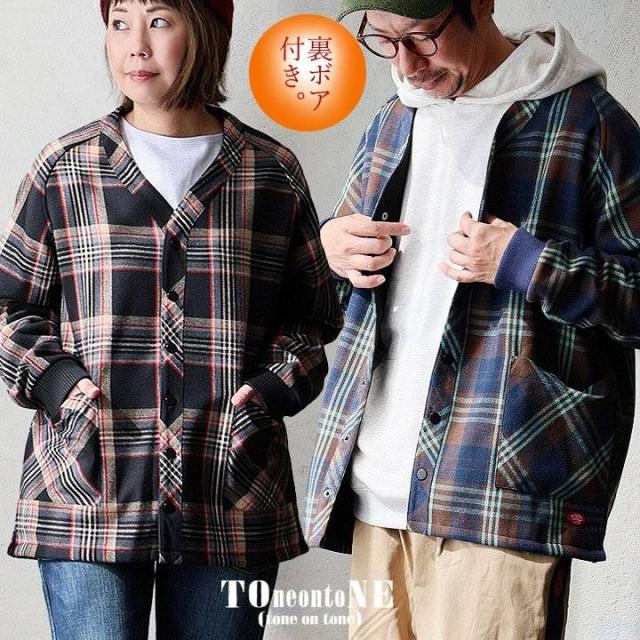 カーディガン 暖かい 裏フリース メンズ レディース 長袖 袖リブ ネルチェック ワイド しっかり 丈夫 お尻 隠れ カバー 起毛 ポケット スナップボタン カジュアル 総裏地 秋 冬 洗濯可 パティ TOneontoNE トーン
