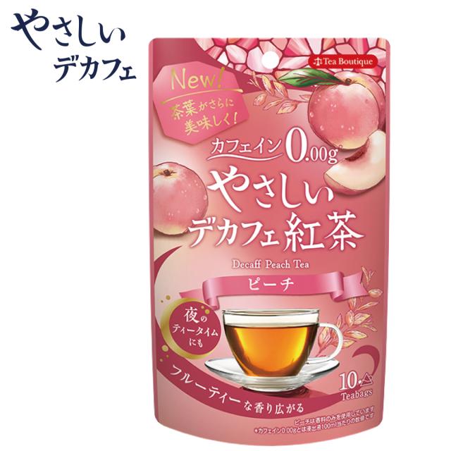 「やさしいデカフェ紅茶 ピーチ」はみずみずしい白桃のフレーバーティー。白桃の芳醇な香りが、あなたのティータイムを彩ります。