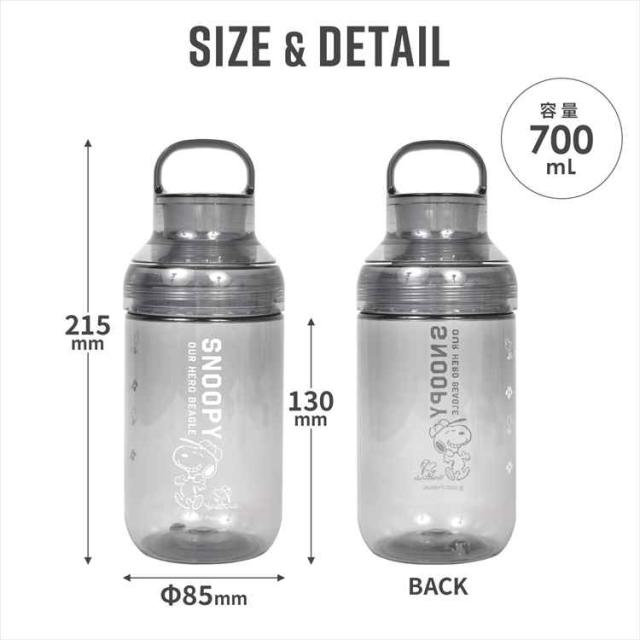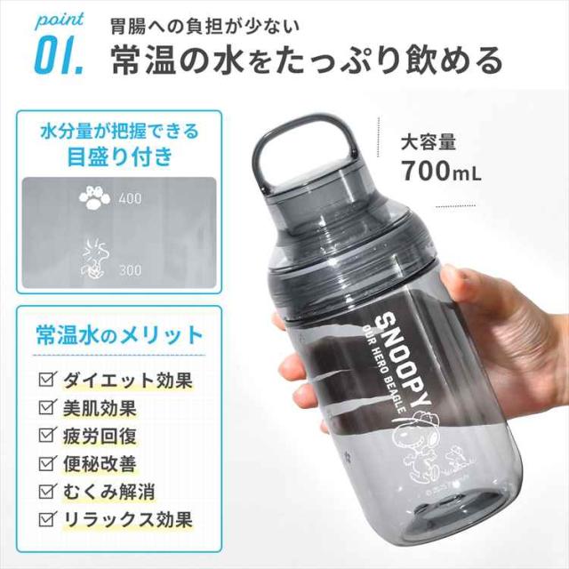 ウォーターボトル スヌーピー SNOOPY 700ml 目盛り 洗いやすい 広口 軽量 日本製 直飲み 水筒 透明 常温 耐熱 クリアボトル 持ち手付き 持ち運び キャラクター かわいい おしゃれ シンプル 割れにくい ジム ヨガ サウナ 通勤 通学 スポーツ 運動 部活 旅行 女性 女の子