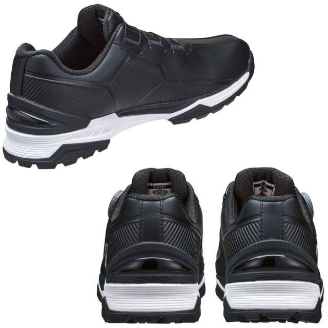 前モデル(SHG380)対比 “足幅”を広げ、圧迫感のない“よりゆったりとした履き心地”にこだわったモデルです。上層(柔らかめ)と下層(硬め)の硬度を変えた新設計「2重構造ミッドソール」と、踵部の「TPU製ヒールカウンター」により、クッション性と安定性を確保しています。さらに、インソールは「ゼロ・スパイク バイター ツアー(SH2401) 」で好評のクッション性の高い「2層インソール」を使用することで、高いクッション性を追求しました。グリップ性能については、新設計アウトソールを採用することで高いグリップ力を追求しています。また、雨にも強い防水仕様となっています。デザインは、幅広でもすっきりと見えるスポーティなアッパーデザインで、WK(白/黒)、BK(黒)に加え、落ち着きのあるアースカラーのWL(白/オリーブ)を加えた3色展開のラインアップです。