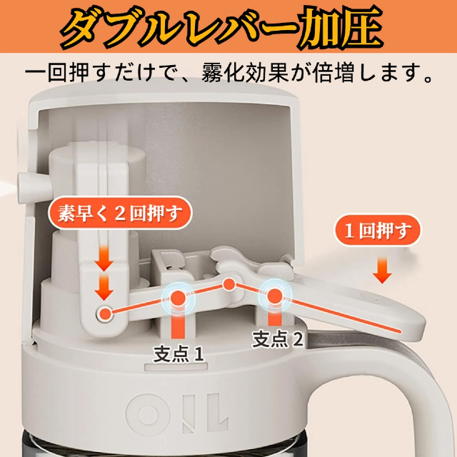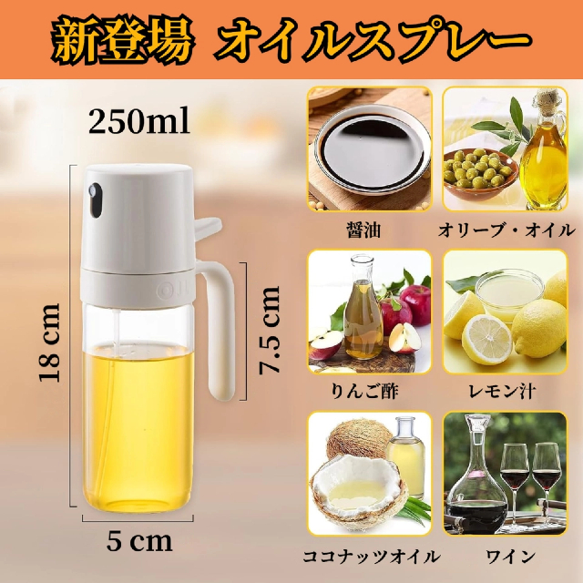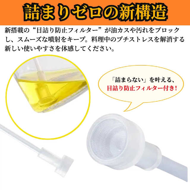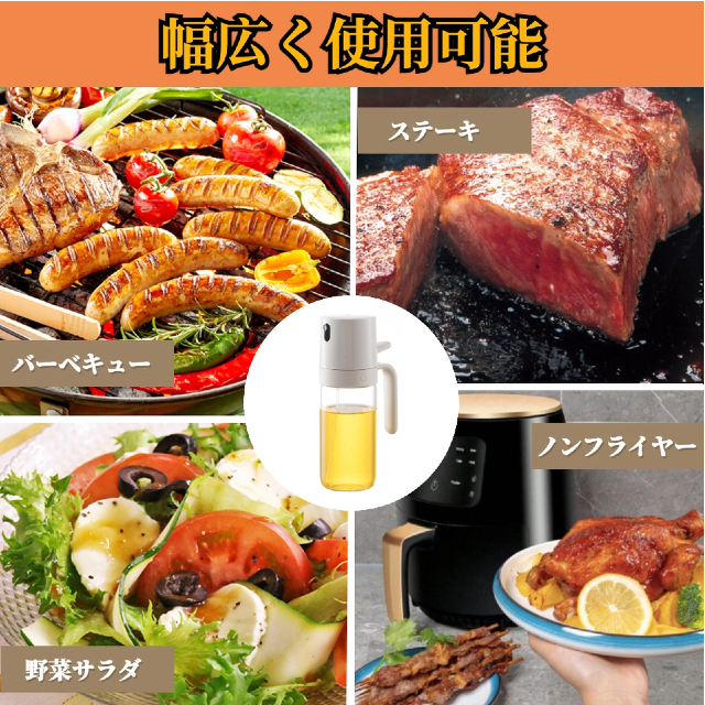 密閉性を高め、液漏れを防ぐリークプルーフデザインをアップグレードしました。 大口径のボトルは、漏斗を使わなくても食用油を簡単に入れることができます。 この必要不可欠なキッチンガジェットはとても便利で、ボタンを押し続けるだけで、細かいミストを噴出します。