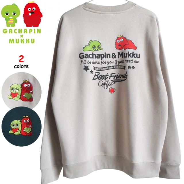 送料無料 ガチャピン ムック トレーナー メンズ スウェット 裏起毛 ガチャムク 大人 レディース 大きいサイズ 刺繍 バックプリント ノックダウン へとへと おつかれ 脱力系 かわいい トップス ゆったり 秋冬 ペアルック 部屋着 防寒 厚手 あったか ベージュ モスグリーン