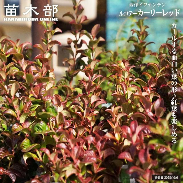 「ルコテー カーリーレッド」は、厚い葉がカールするユニークな見た目がかわいらしいイワナンテンです。春夏は緑葉で新芽のみ赤く、秋冬は全体が紅葉して見頃になります。コンパクトに育ち、伸びがゆっくりなので寄せ植えに最適です。葉が厚く、性質も丈夫なので初心者にも超おすすめの庭木です。