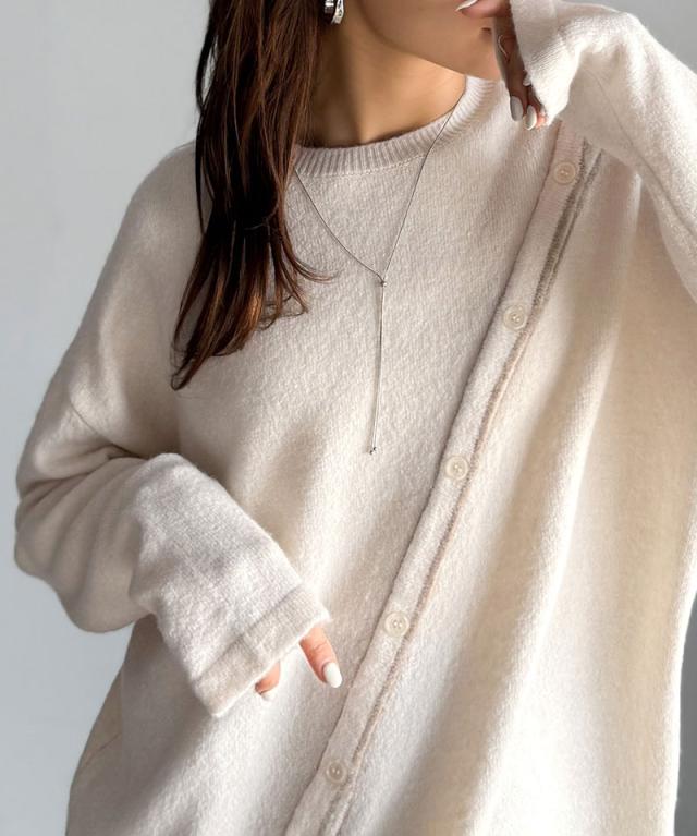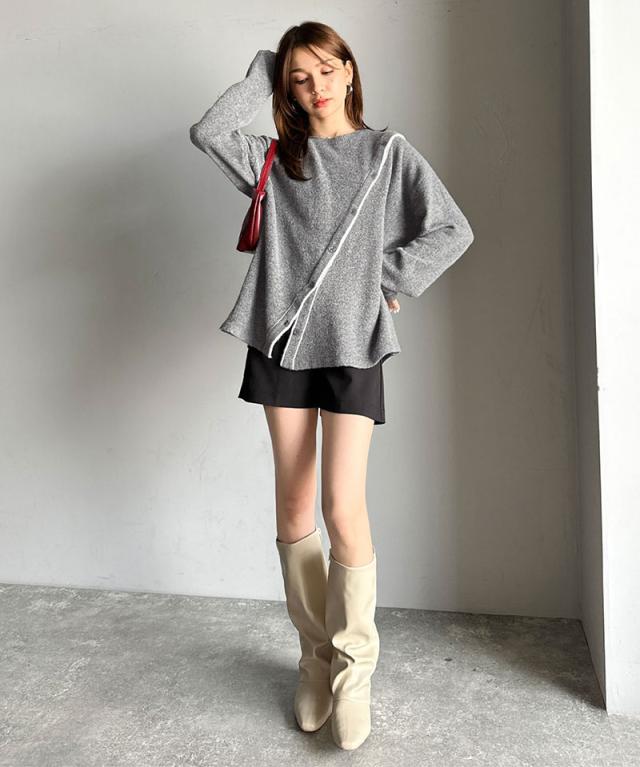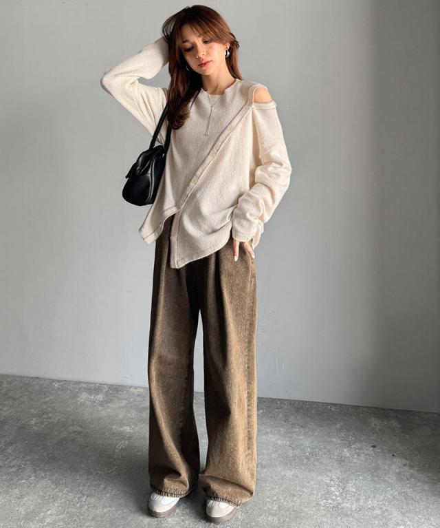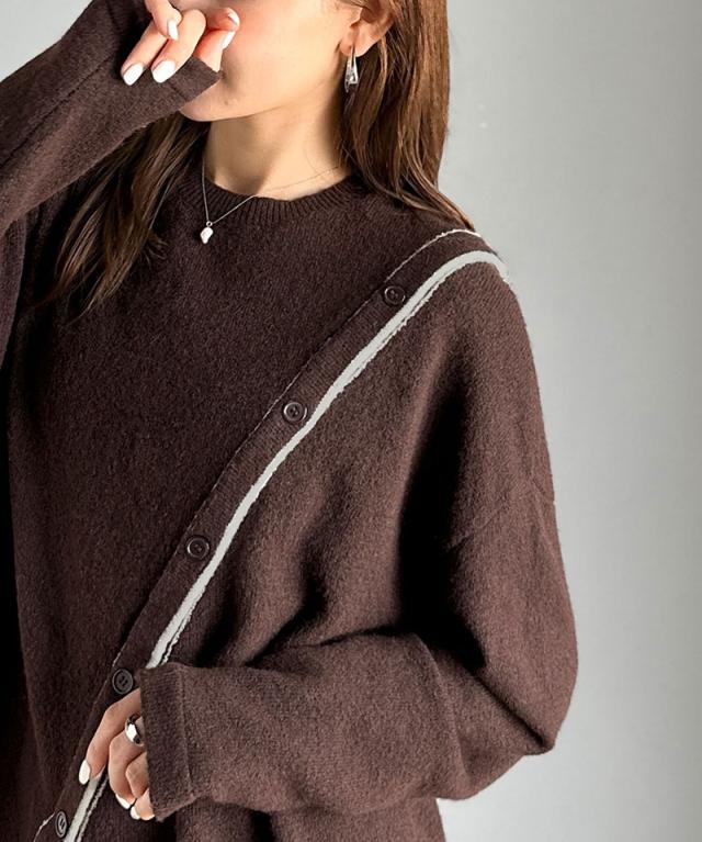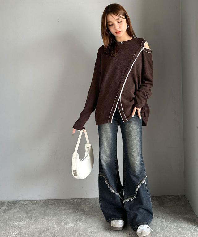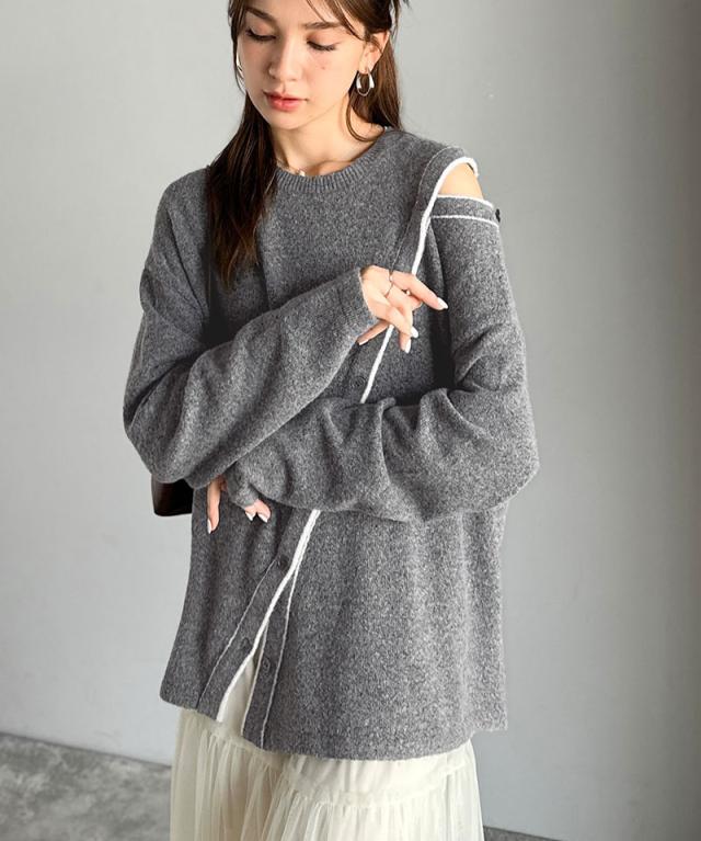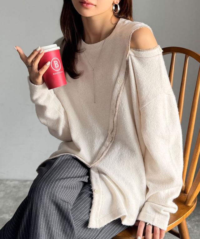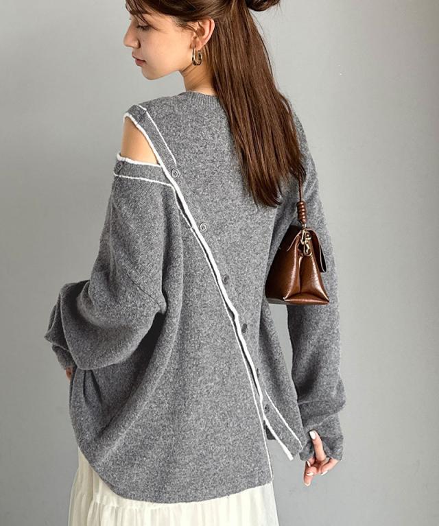 クラシカルエルフ秋新作 mily bilet ニット レディース 長袖 トップス プルオーバー ふわもち 肩見せ 2WAY アシメデザイン 斜め切り替え 配色ライン ゆったり感 ヘルシー カジュアル きれいめ ガーリー トレンド感 日常使い 大きいサイズ 2025aw mi1029161