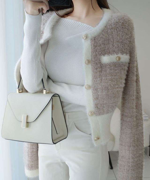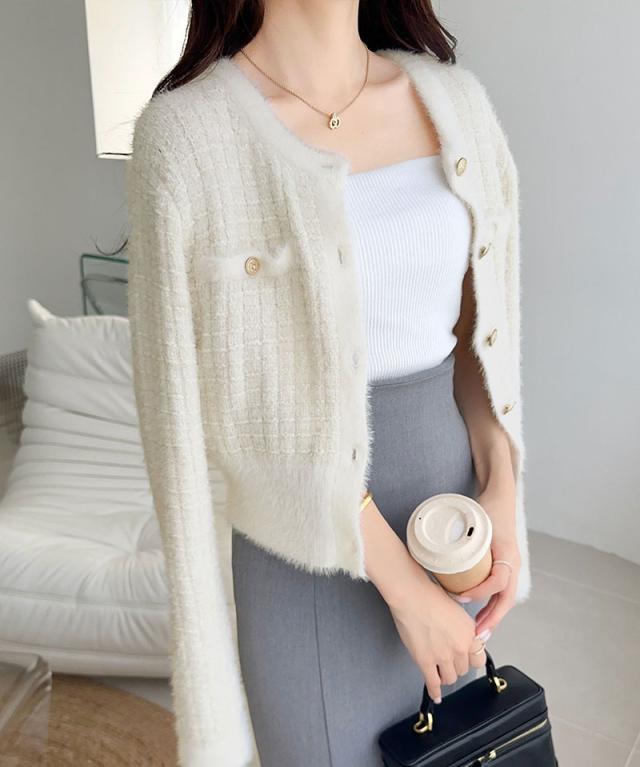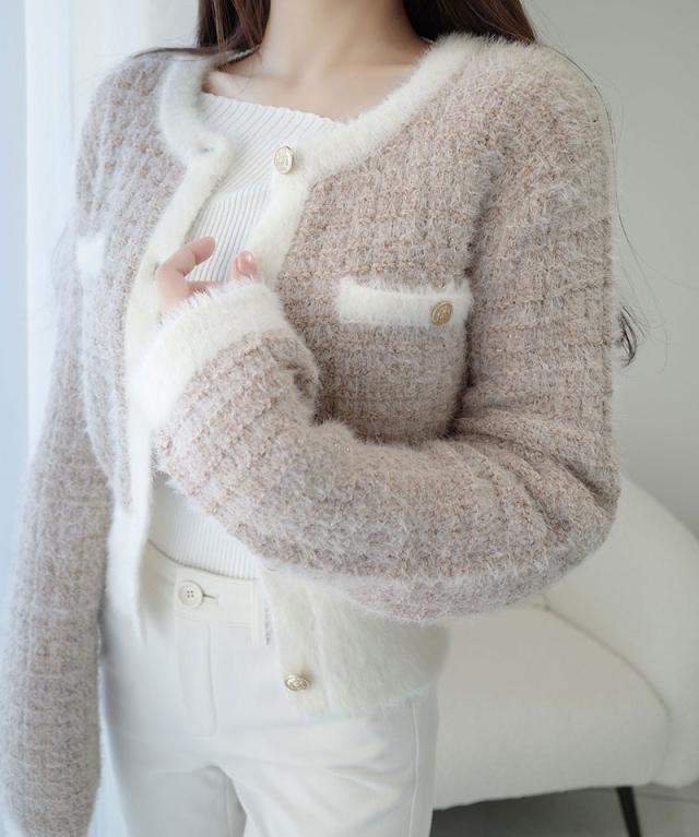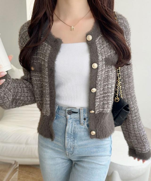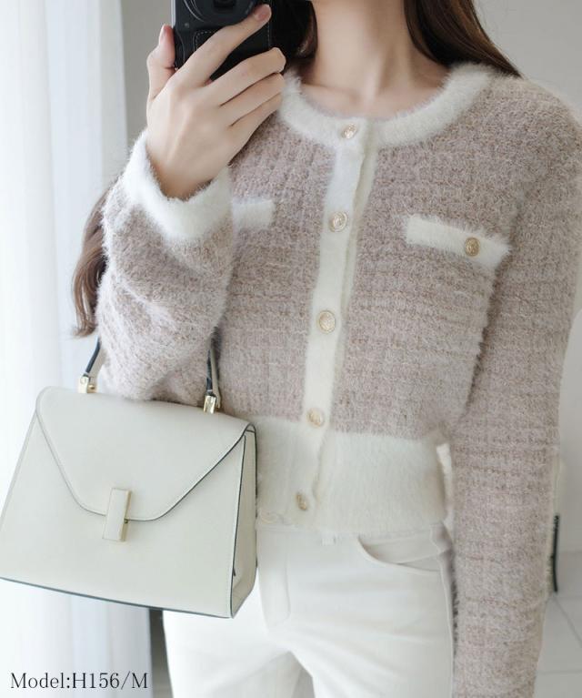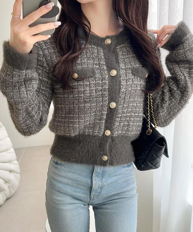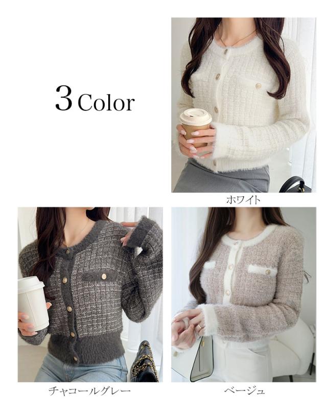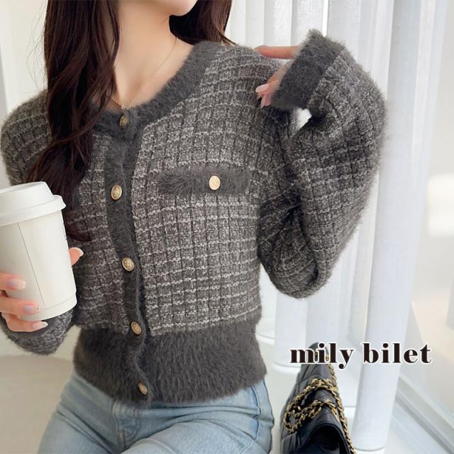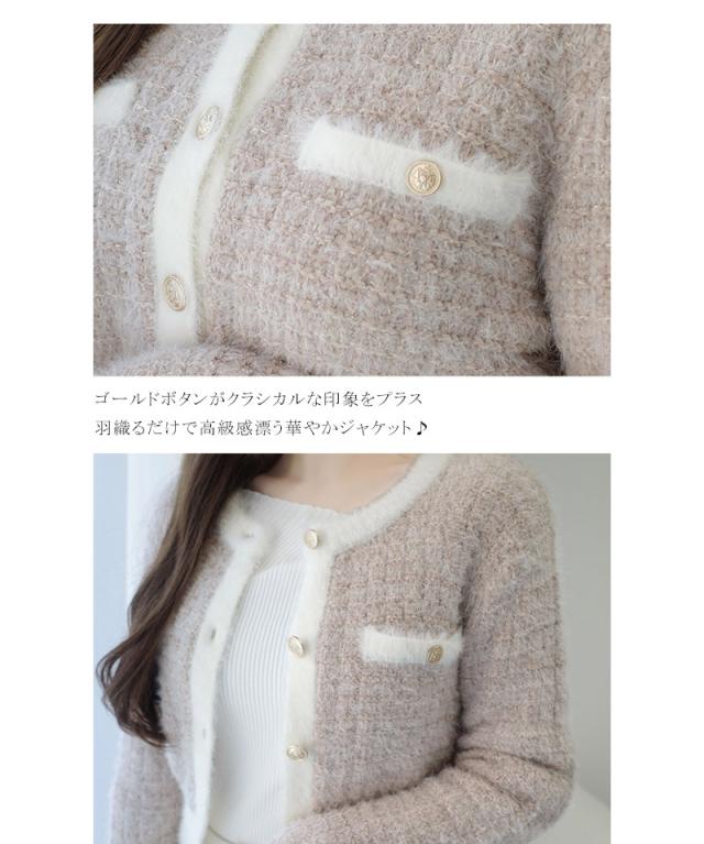 クラシカルエルフ秋新作 mily bilet カーディガン レディース トップス ラメニット ジャケット ツィードライクフェザー ゴールドボタン クラシカル ラメ糸 上品 オンオフ ツイード風 フェザーヤーン シンプル きちんと感 大きいサイズ 2025aw mi1329043