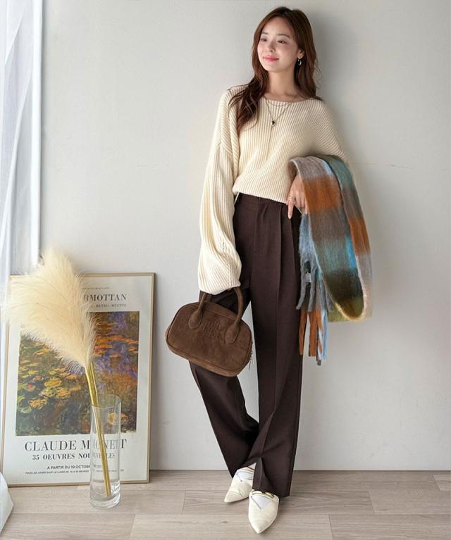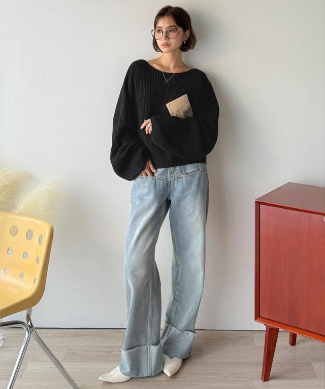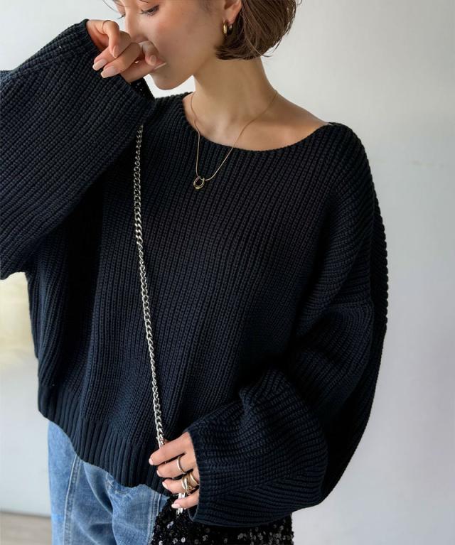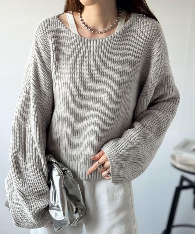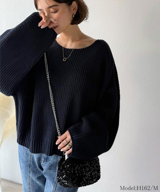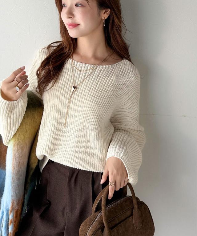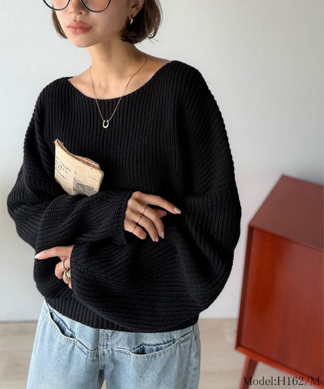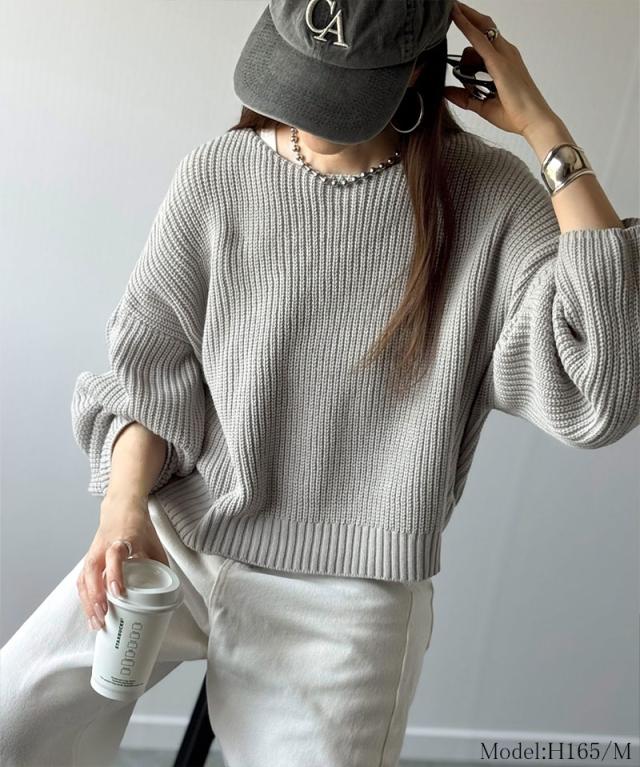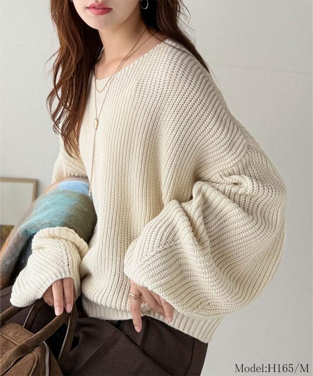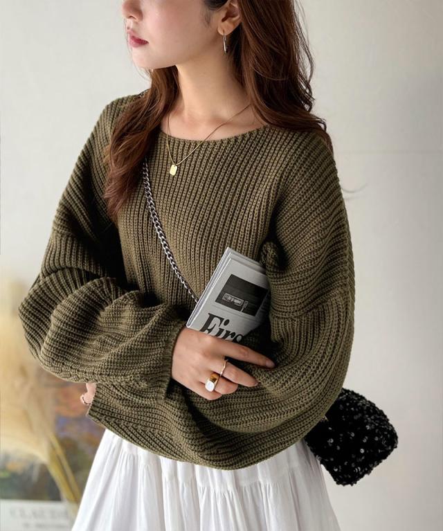 程よく肉厚な畦編みは、着るだけで立体的なシルエットをつくり、ふんわりとした袖が女性らしい柔らかさをプラスします。