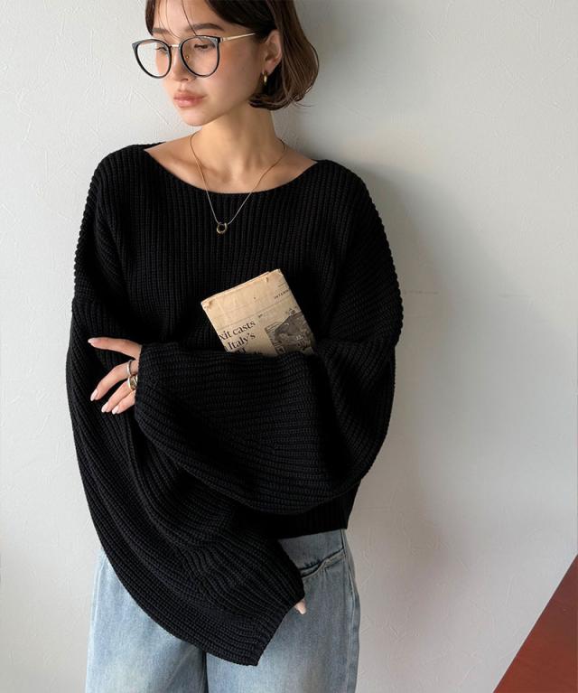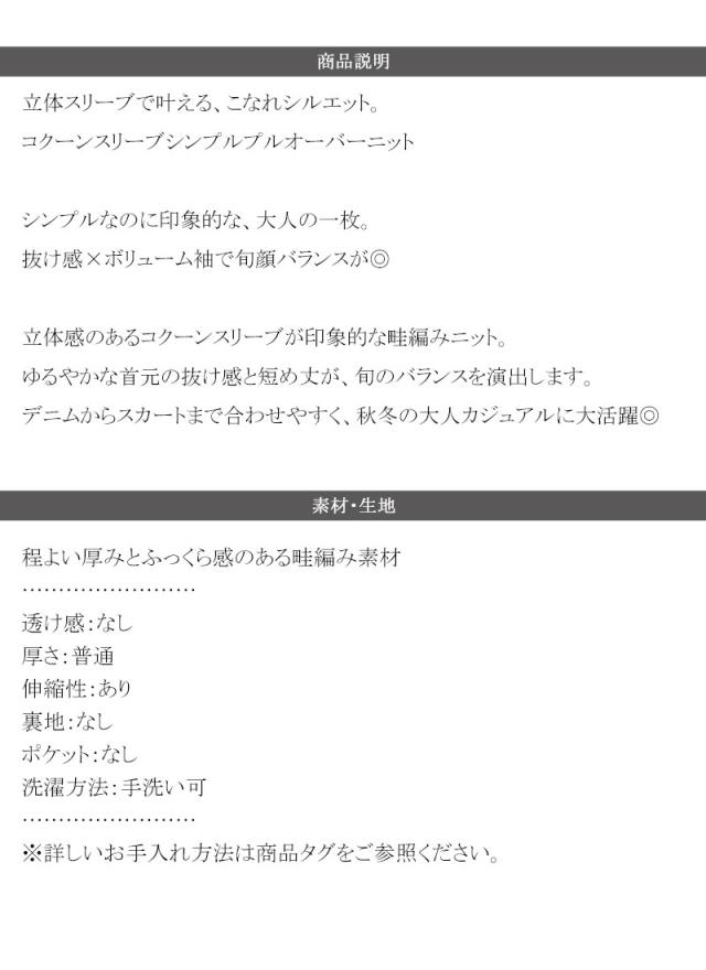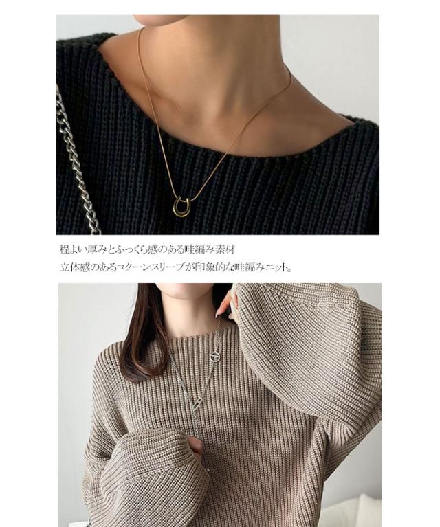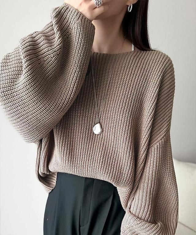 シンプルな中にもさりげない存在感を放つ、コクーンスリーブシンプルプルオーバーニット。