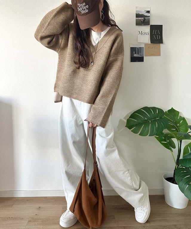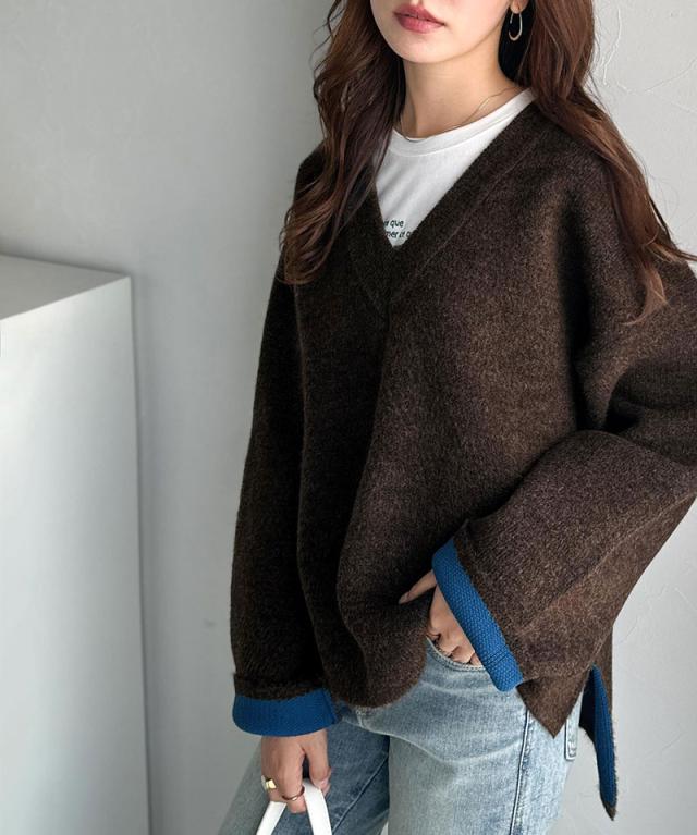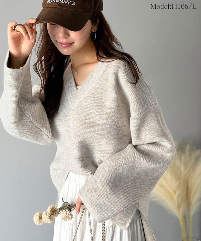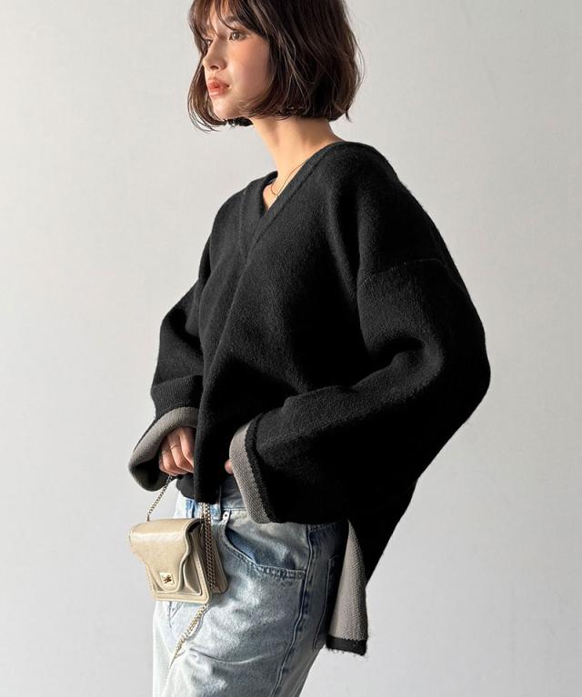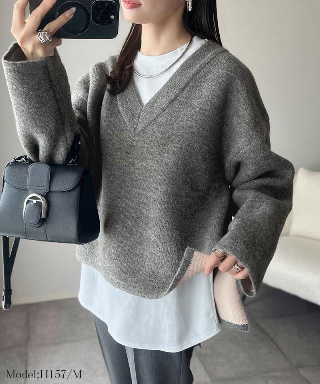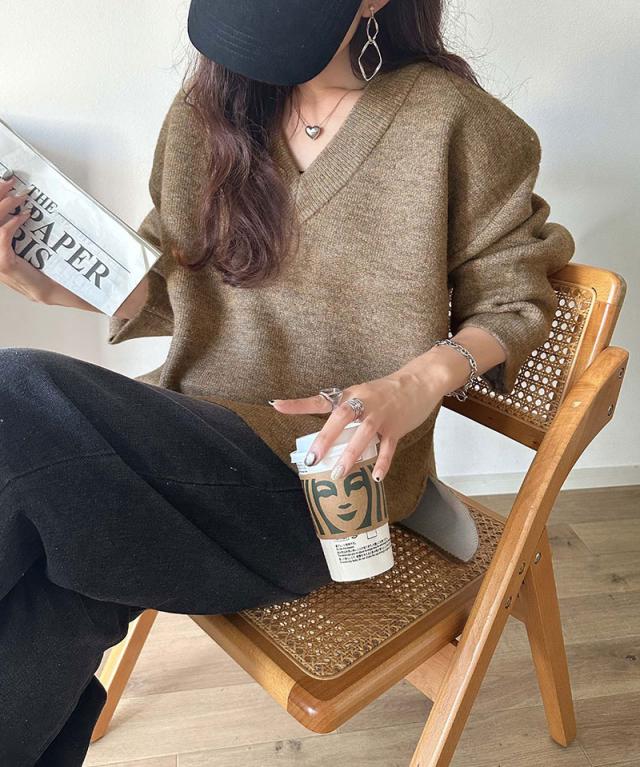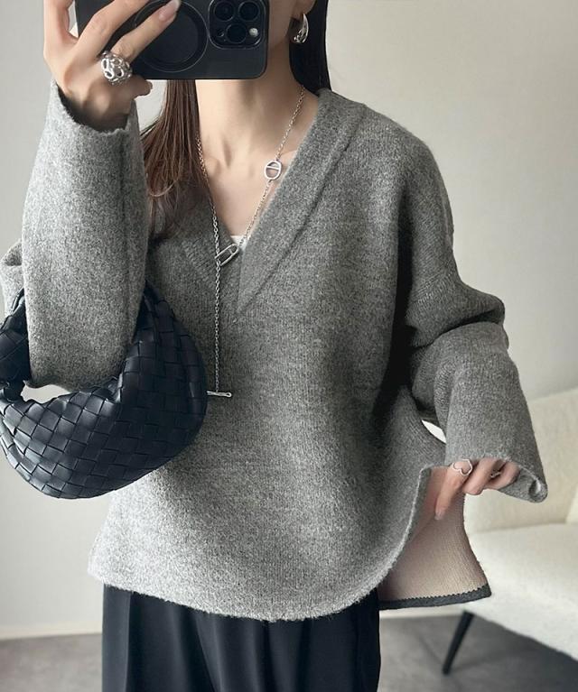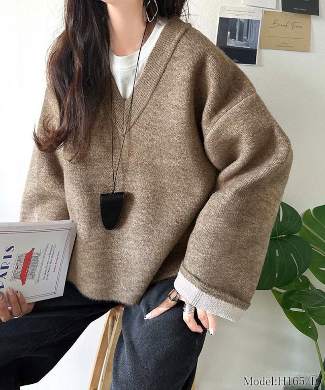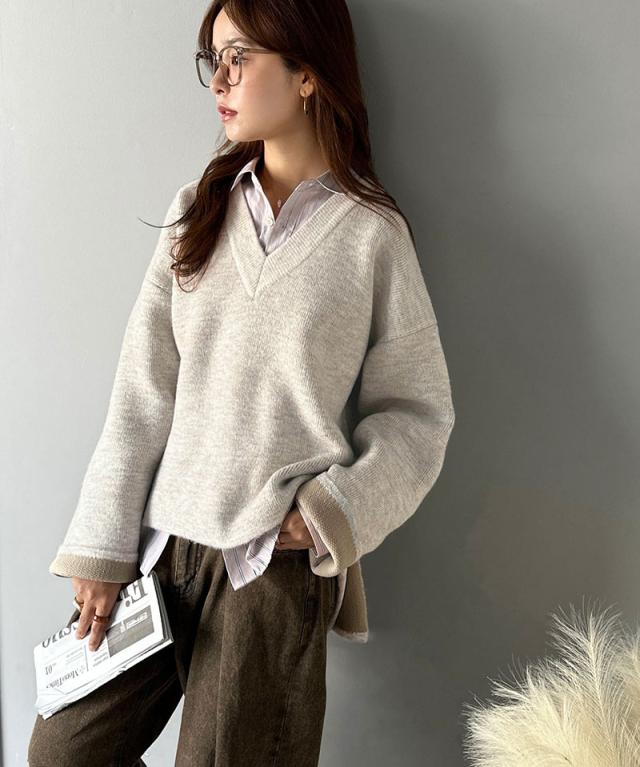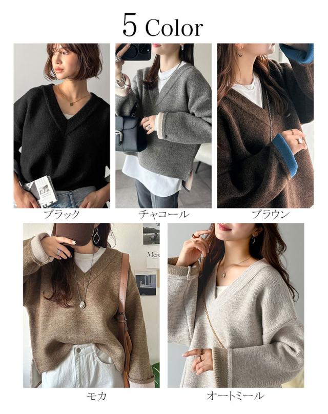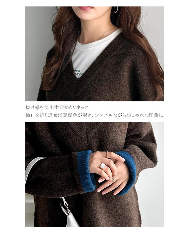 クラシカルエルフ秋新作 ニット レディース 長袖 トップス Vネック プルオーバー 抜け感 すっきり見え 大人カジュアル シンプル ダブルフェイス素材 深めVネック ラウンドヘム 起毛感 カジュアル 軽やか 大きいサイズ 2025aw ce1380011