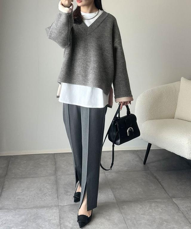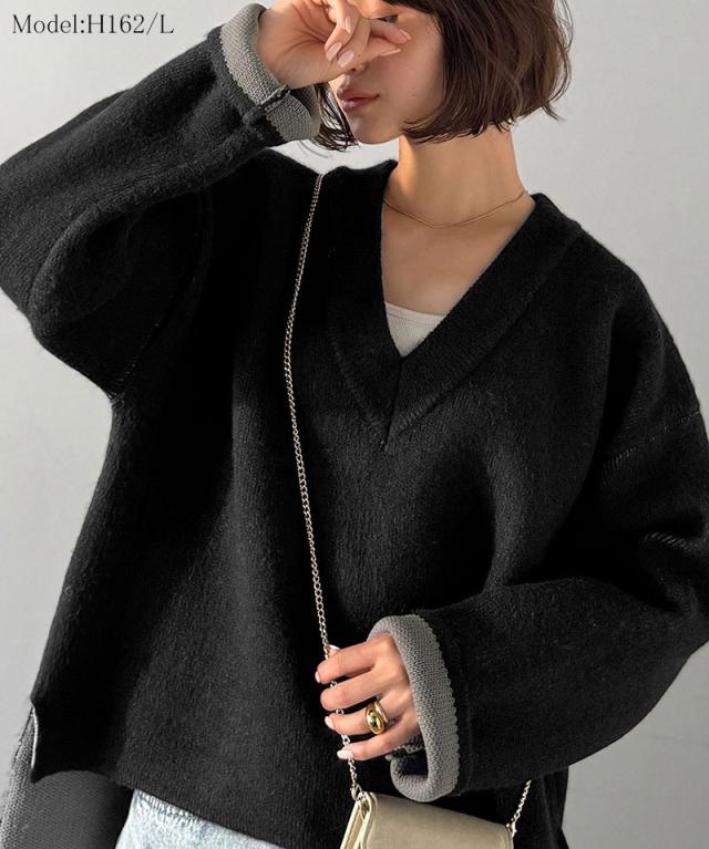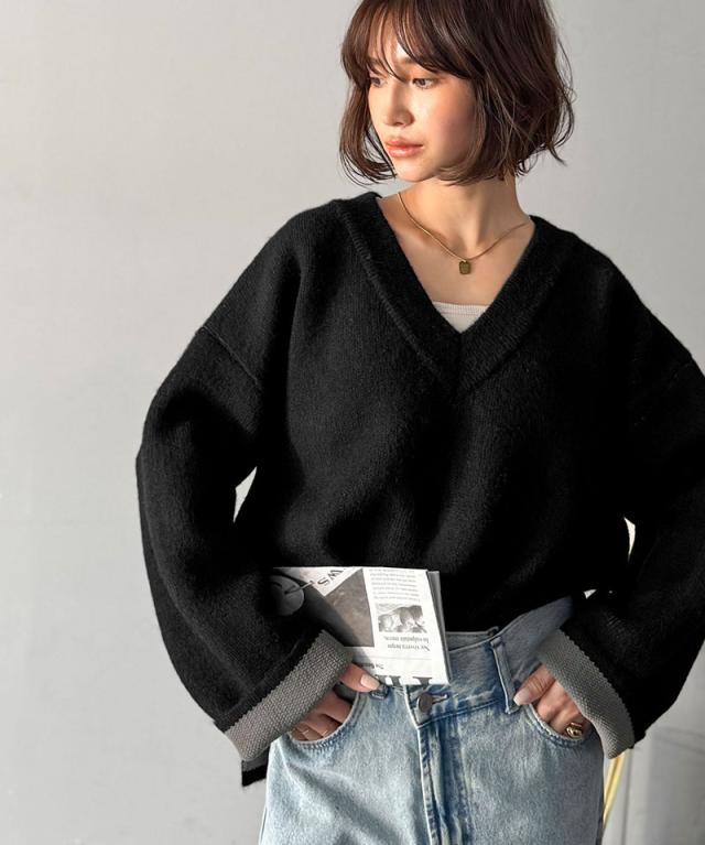 顔まわりをすっきり見せる深めのVネックデザインは、