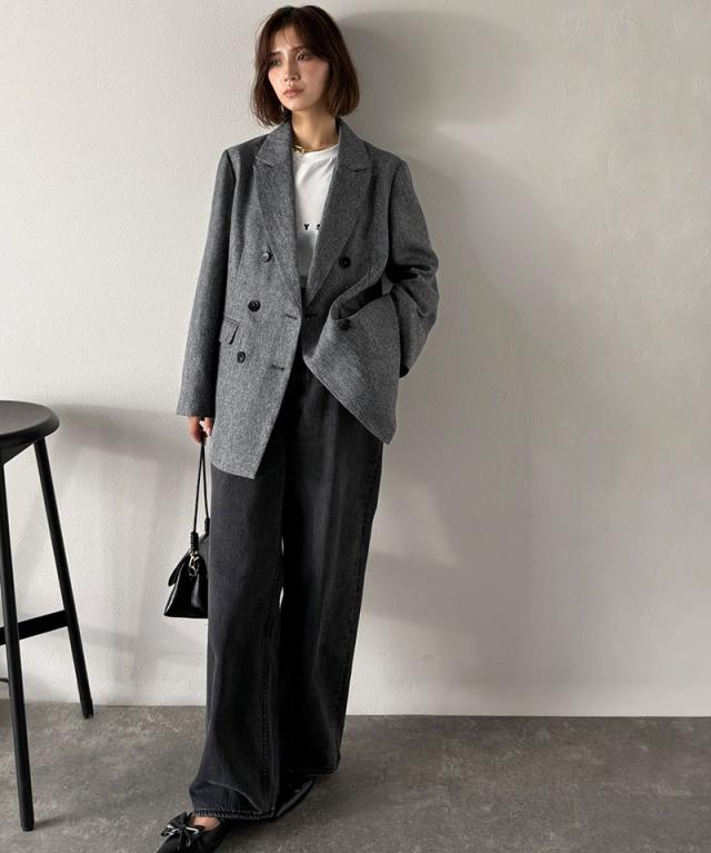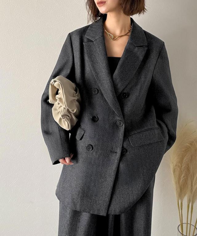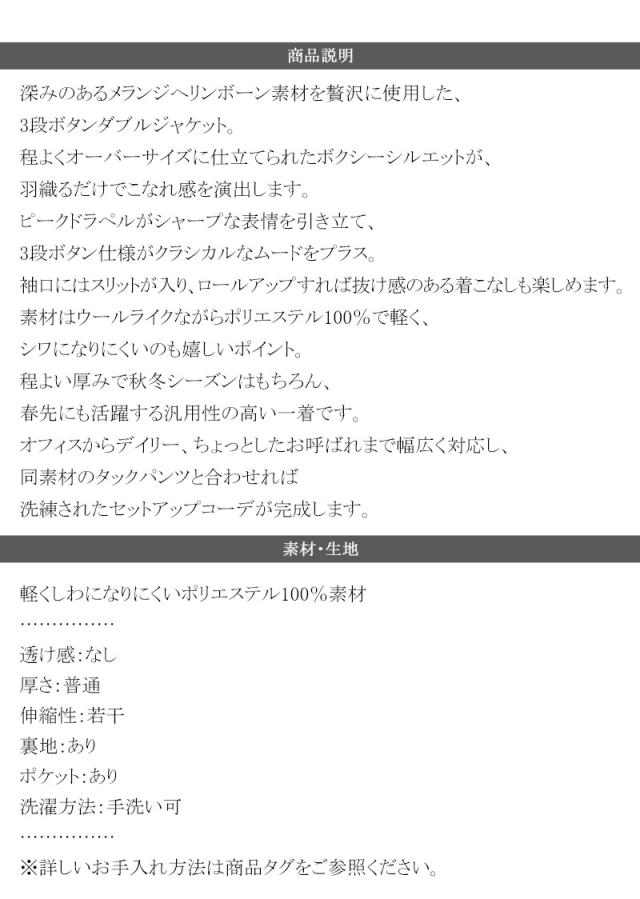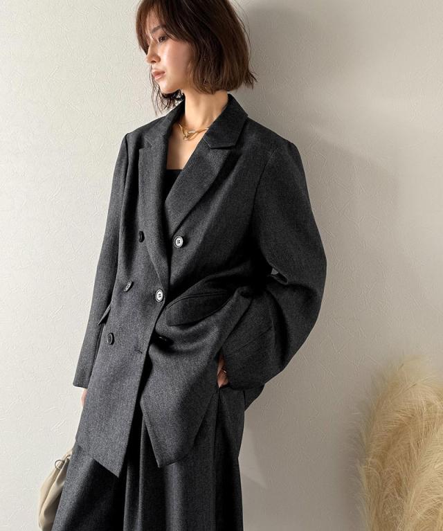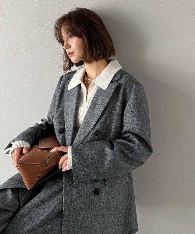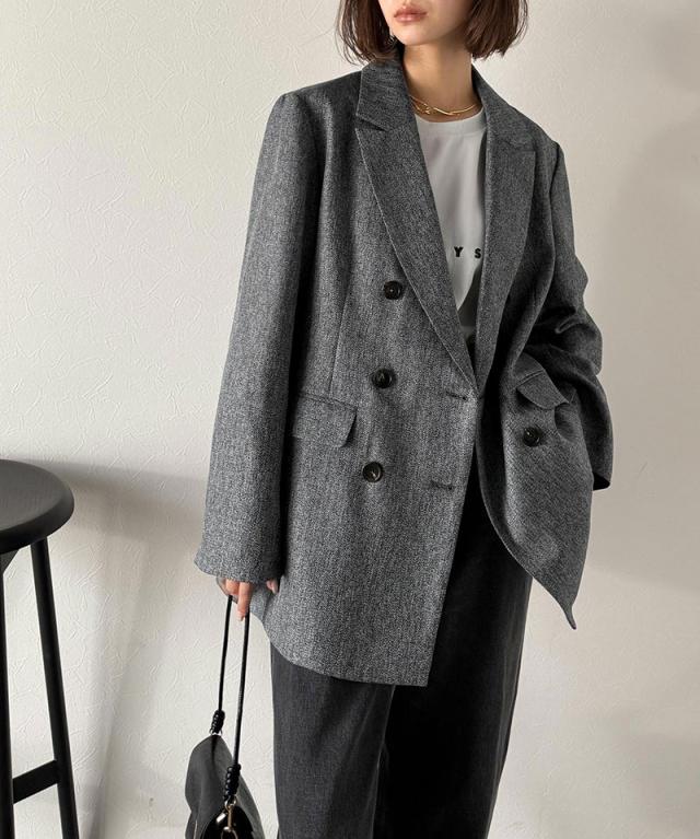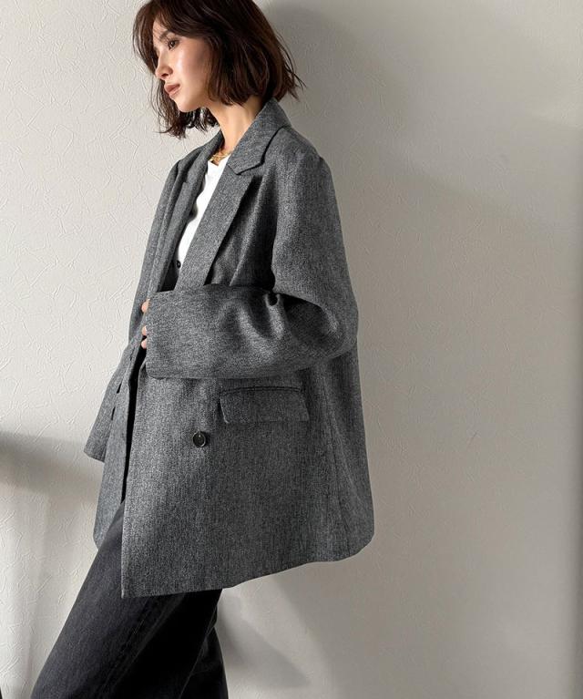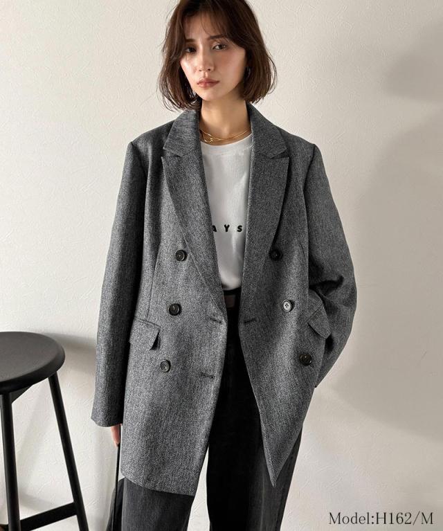 深みのあるメランジヘリンボーン素材を贅沢に使用した、3段ボタンダブルジャケット。