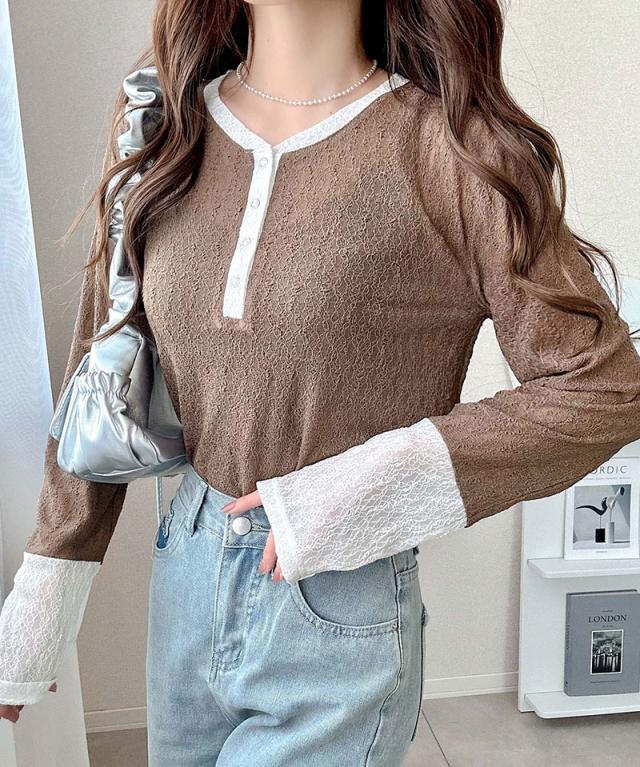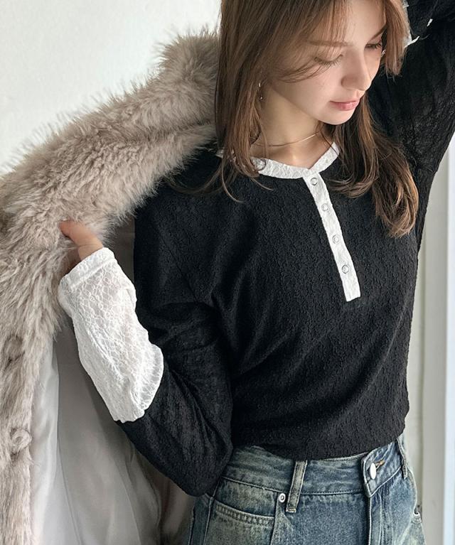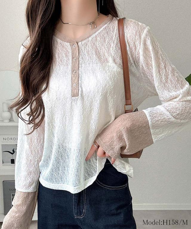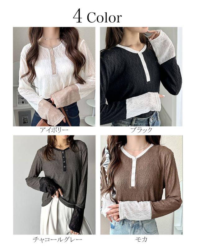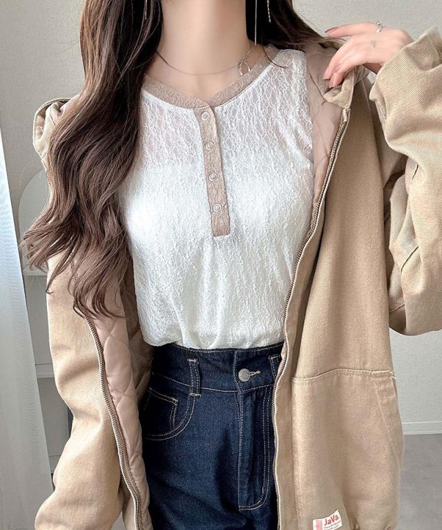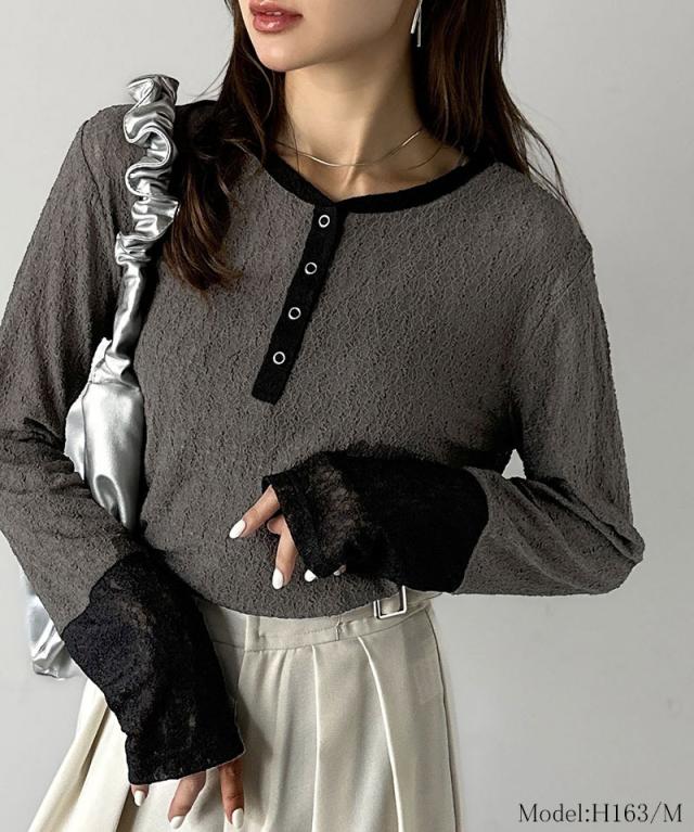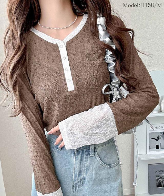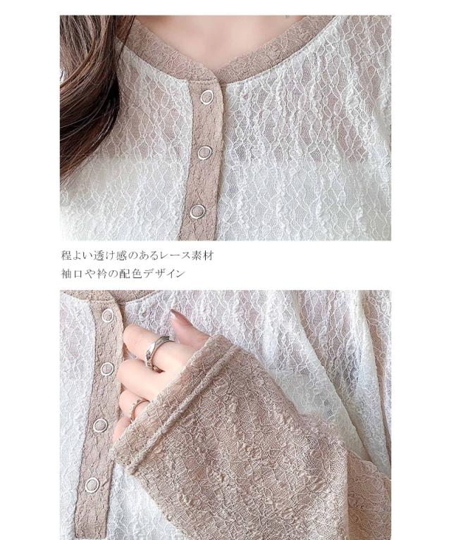 クラシカルエルフ秋新作 mily biletトップス カットソー レディース ヘンリーネック 袖配色レース シンプル フェミニン カジュアル リングドット釦 カジュアル 上品 配色アクセント デイリー レース素材 ベーシック インナー 大きいサイズ 2025aw mi1019107