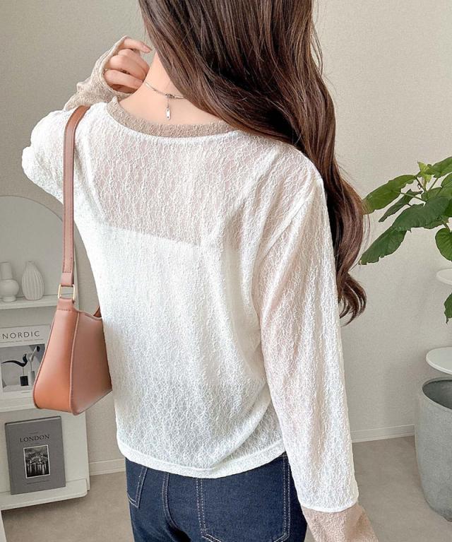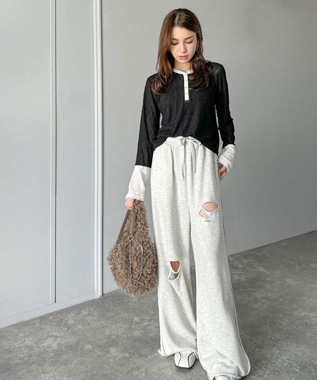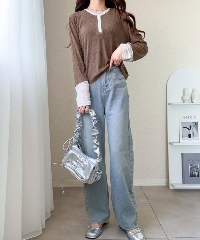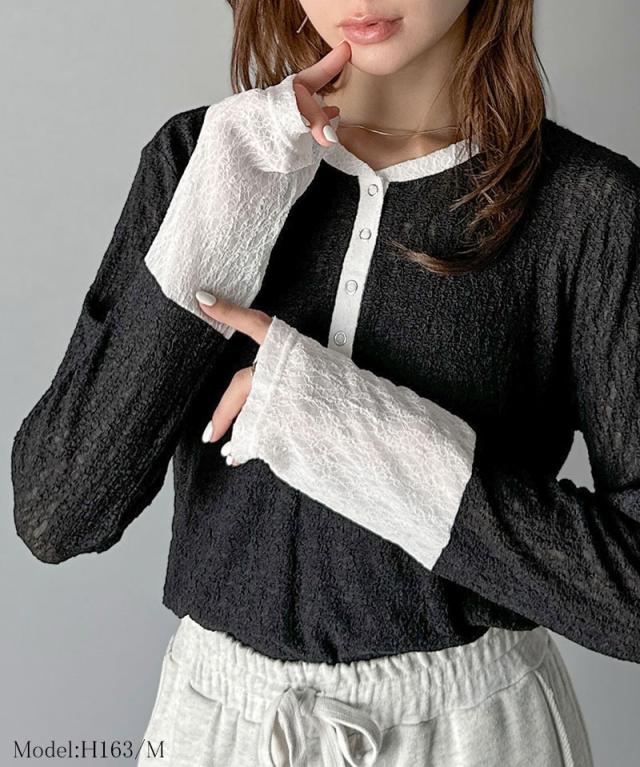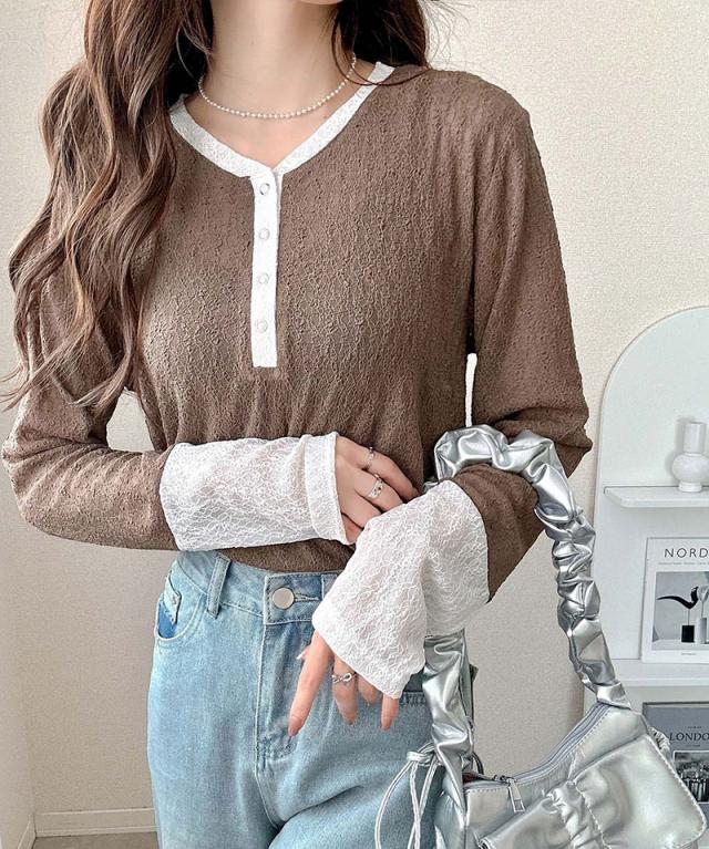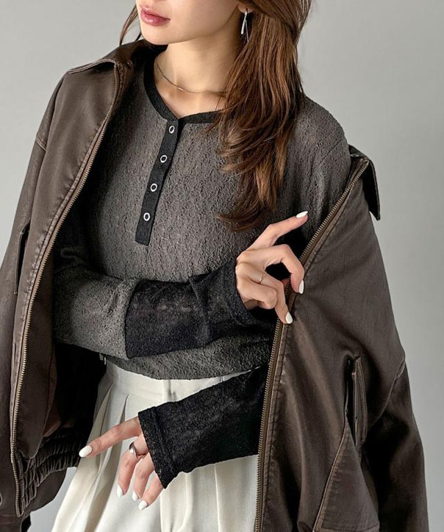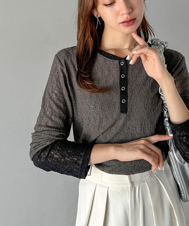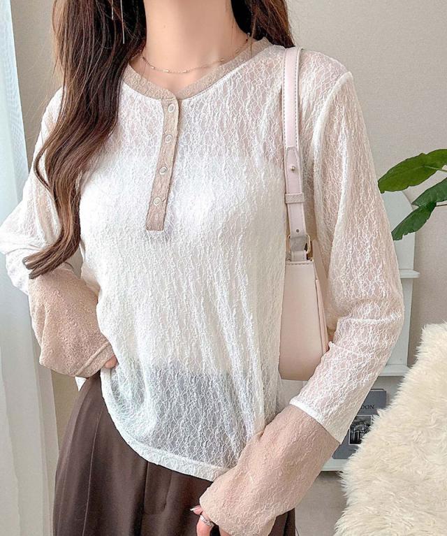 クラシカルエルフ秋新作 mily biletトップス カットソー レディース ヘンリーネック 袖配色レース シンプル フェミニン カジュアル リングドット釦 カジュアル 上品 配色アクセント デイリー レース素材 ベーシック インナー 大きいサイズ 2025aw mi1019107