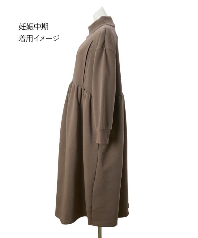 あたたかな裏起毛素材のマタニティ長袖ワンピースです。