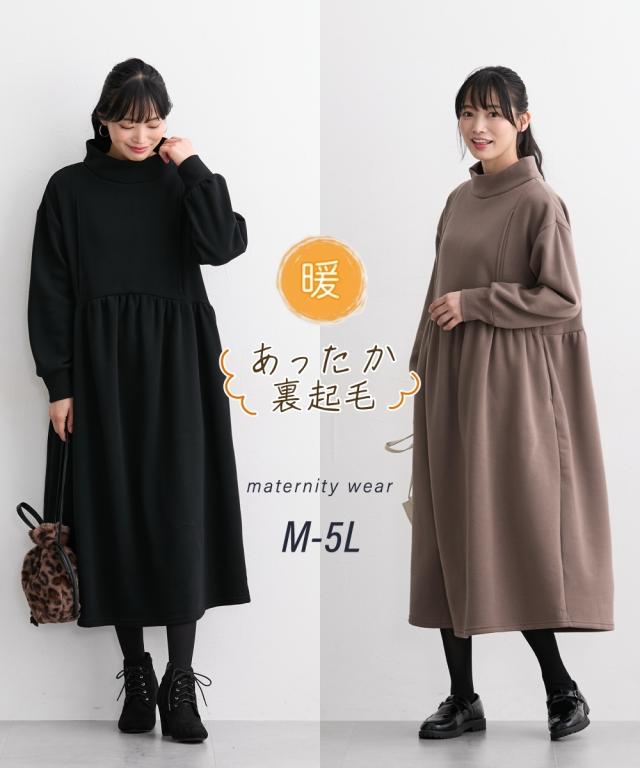 マタニティ ワンピース 授乳服 ママ ウェア あったか裏起毛 ウエスト ギャザーモックネック 産前 産後 冬 産前 産後 | 5L | ニッセン nissen