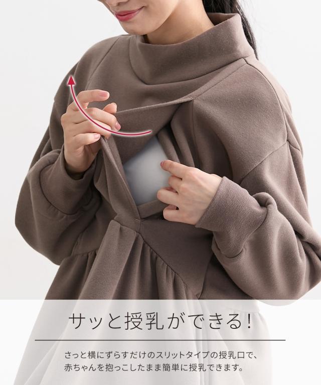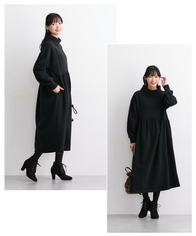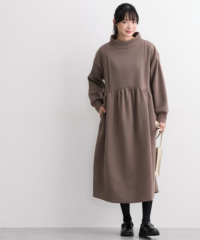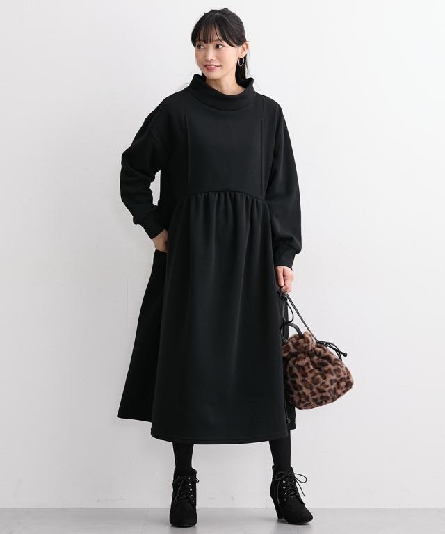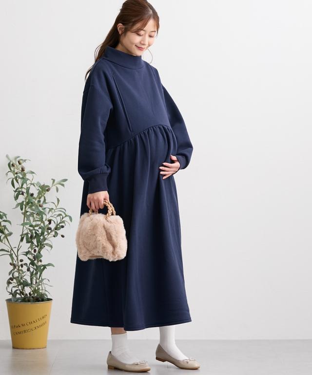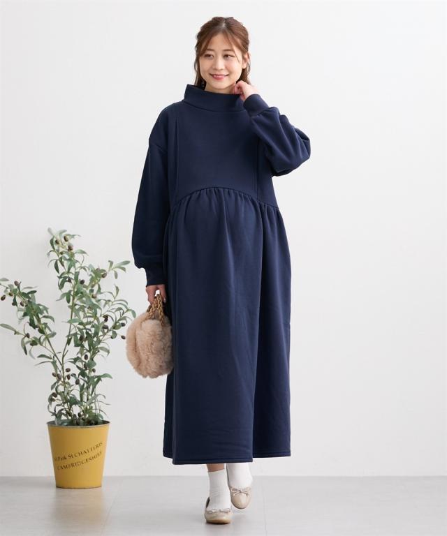 【マタニティウェア・授乳服】あったか裏起毛 ウエストギャザーモックネックワンピース(産前・産後)