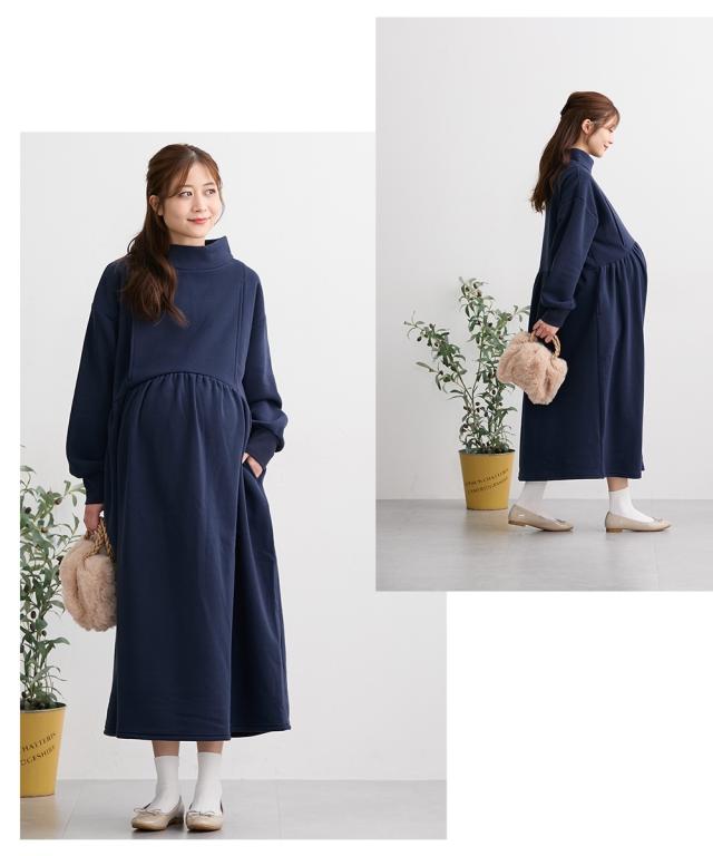 あたたかな裏起毛素材のマタニティ長袖ワンピースです。