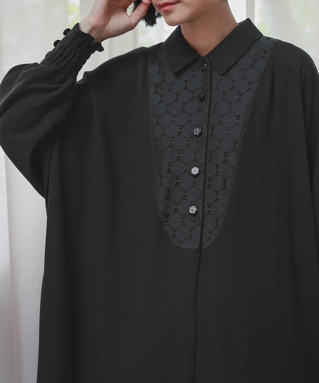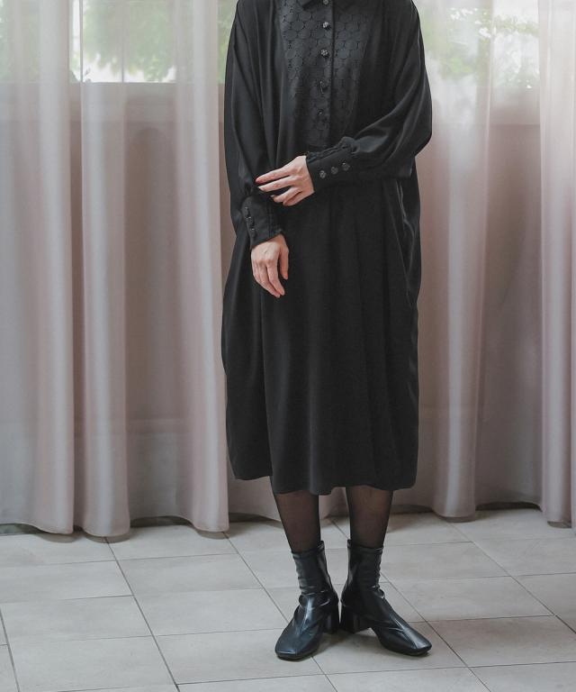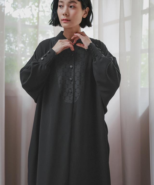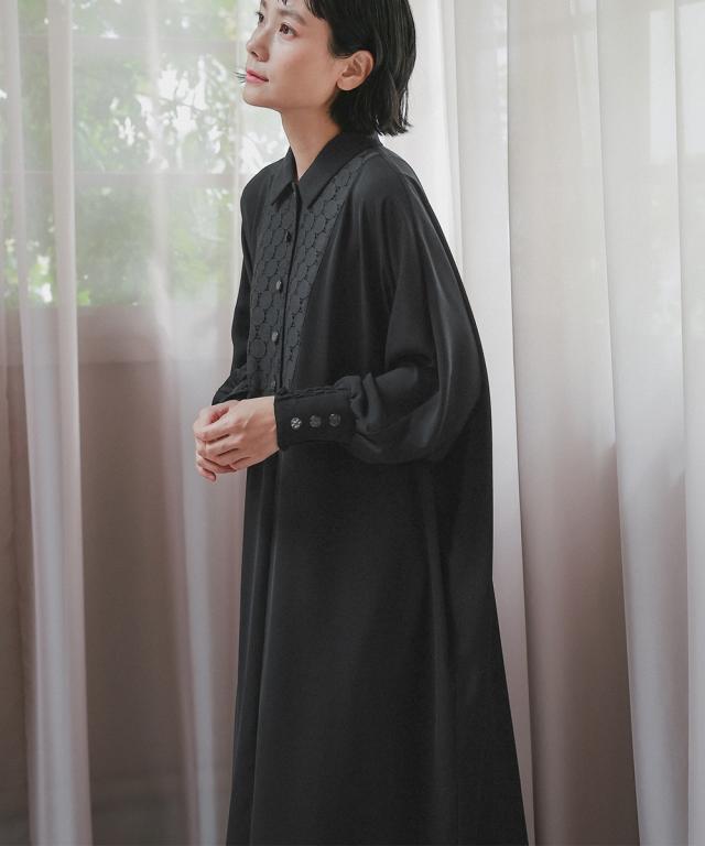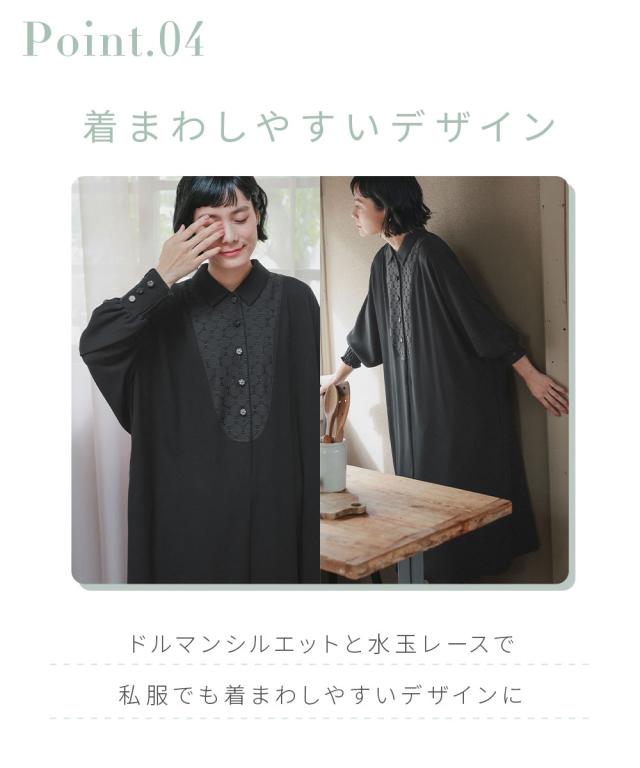 【喪服・礼服】袱紗も入るポケット仕様 洗える防しわ水玉レースドルマンスリーブワンピース(ペチコート付き) 〔Neina〕