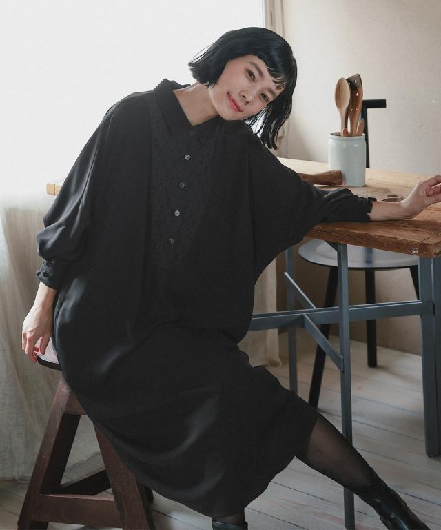 喪服 礼服 ブラックフォーマル レディース 袱紗も入るポケット仕様 洗える防しわ水玉 レース ドルマンスリーブ ワンピース ペチ コート 付き 〔Neina〕 ニッセン