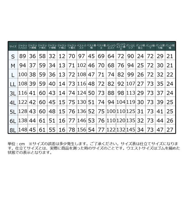 品質=[表地]ポリエステル100%(ストレッチ織物) [裏地]有(ジャケット:背抜き・ベスト:総裏 ストレッチ裏地使用)パンツ無 ジャケット:肩パッド無 前ボタン開 ポケット前2・左内 袖口ベンツ 後ベンツ ベスト:ポケット前2 両脇スリット パンツ:前ホック内ボタン付ファスナー開 ウエスト後ゴム入 ポケット両脇・後飾り ※この商品は3点同サイズのみで販売します。 ※ジャケットはLLサイズから四面体仕様です。 原産国:中国製(企画デザインは日本) 備考:洗濯機OK ネット使用 単位:cm ※サイズの誤差は多少発生します。ご了承ください。サイズ表は仕立てサイズになります。仕立てサイズとは、実際に商品を測った時のサイズのことです。ウエストサイズはゴム