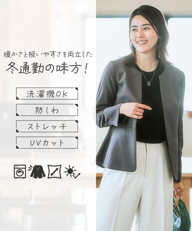 スーツ レディース ペプラム ジャケット パンツ ノーカラー +ワイド ストレッチ ウール調シリーズ 冬 ビジネス セットアップ | S/M/L | ニッセン nissen